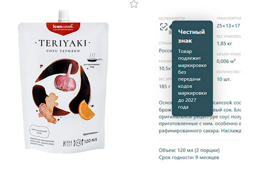 Кроме того, символ маркировки и предупреждение «Товар поставляется только партнерам — участникам "Честного знака"» можно увидеть в карточке товара.