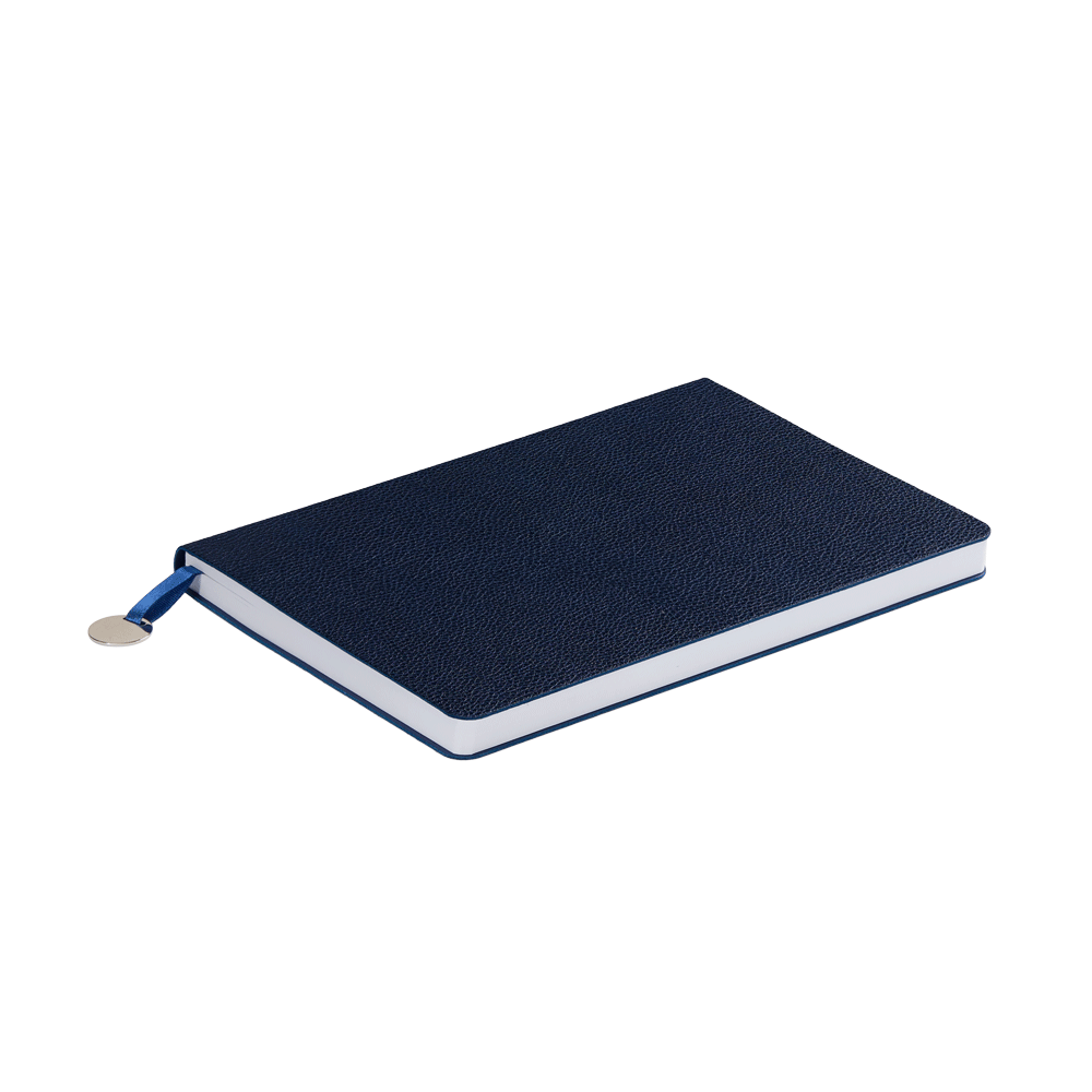 Ежедневник с гибкой обложкой, выполнен из материал La Fite, темно-синий ХХ, дополнен ляссе в цвет обложки с металлическим шильдом.
