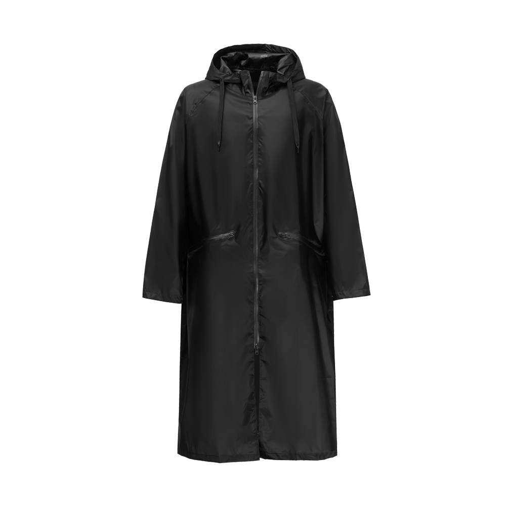 Плащ-дождевик на молнии с капюшоном из ткани таффета с полиуретановой пропиткой для защиты от сильного дождя.