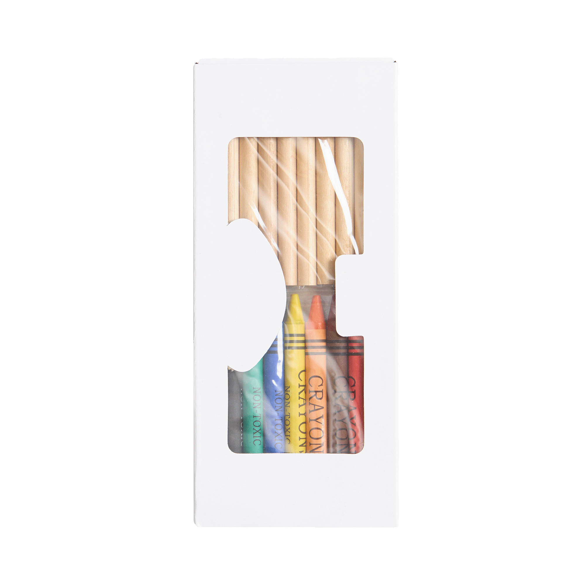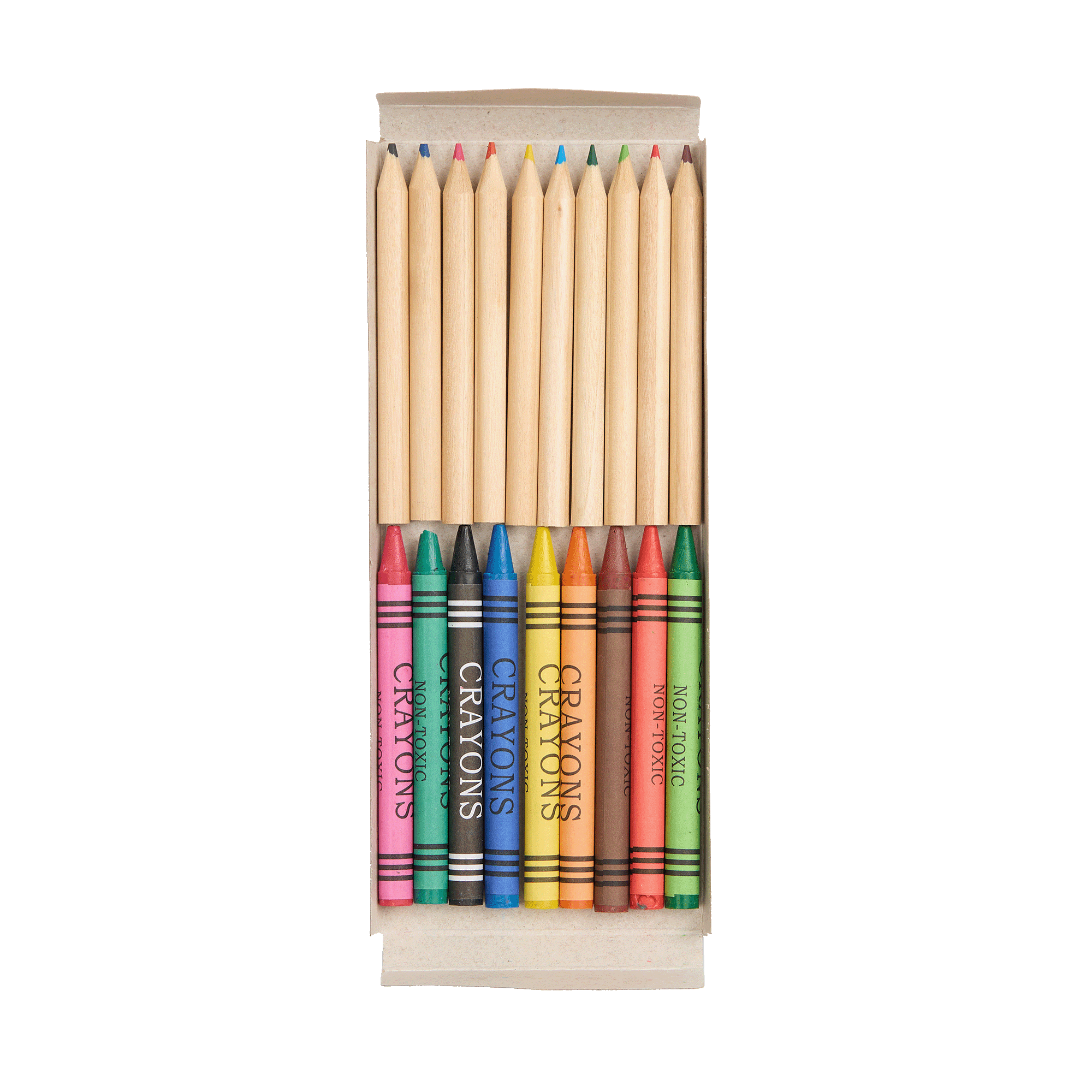 Набор из 10 цветных карандашей и 9 восковых мелков.