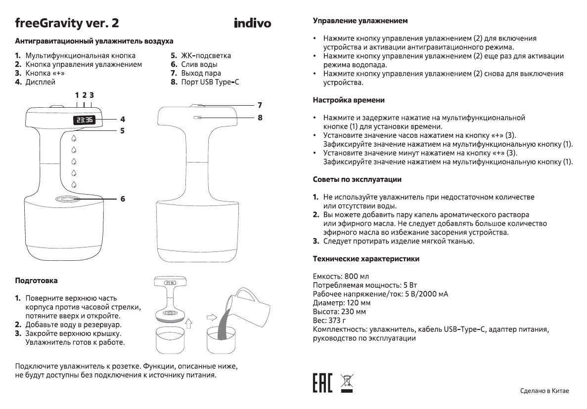 - Антигравитационный режим (с подсветкой), режим водопада (без подсветки)