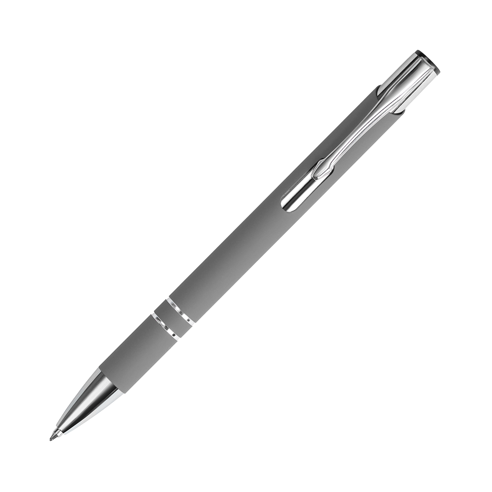 Яркая шариковая ручка с цветным покрытием софт-тач и хромированными деталями.