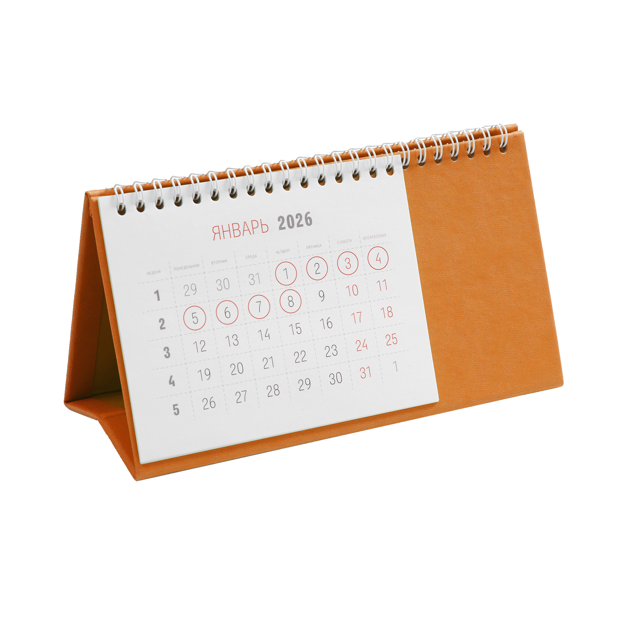 Настольный, перекидной календарь-домик выполнен из материала Latte, оранжевый ОО.