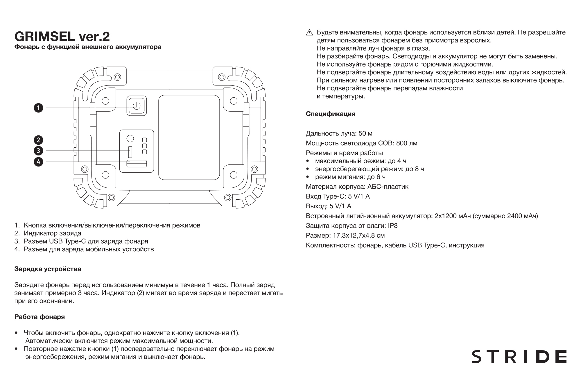 - Время работы в режиме максимальной мощности — 4 часа, в режиме энергосбережения — 8 часа, в режиме мигания — 6 часов.