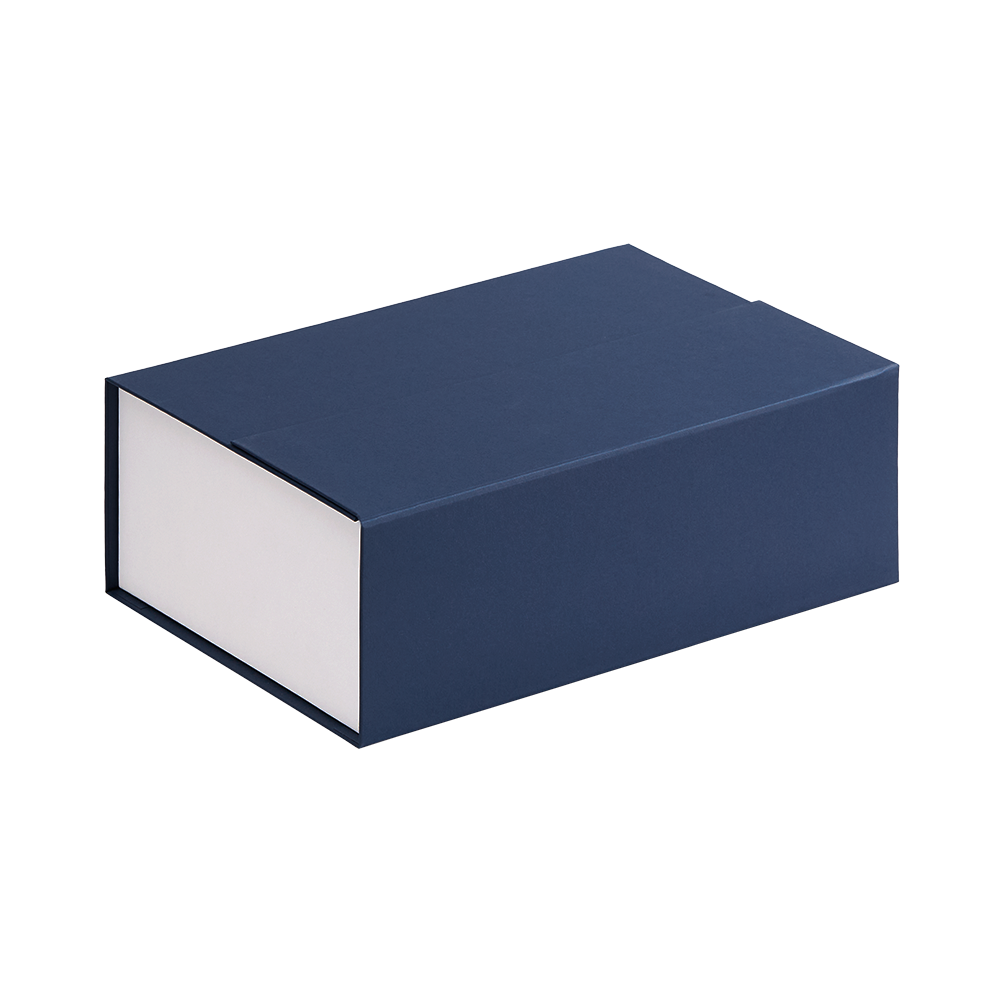 Коробка с клапаном на магните выполнена из переплетного картона, кашированной гладкой дизайнерской бумагой Мalmero двух цветов.