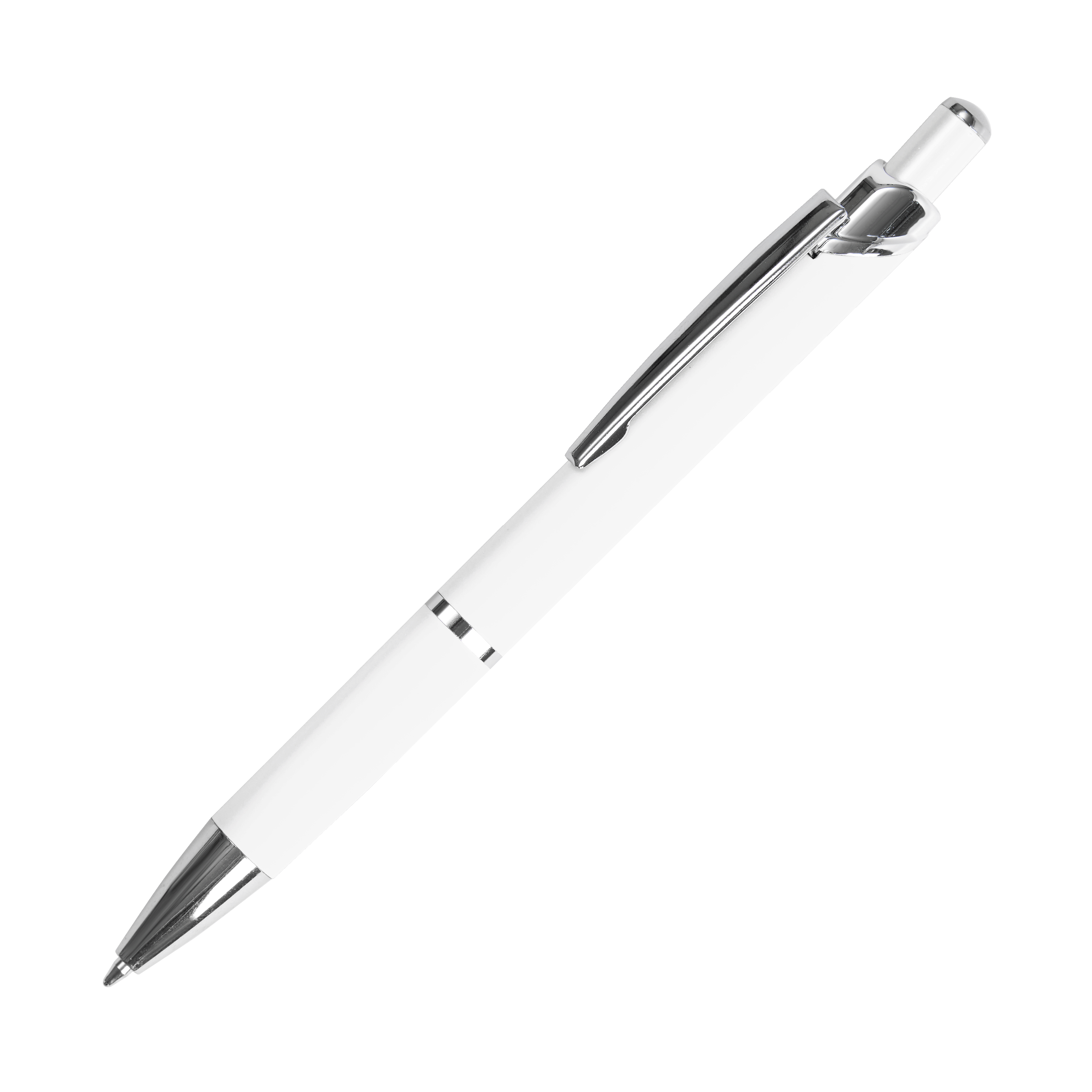 Металлическая ручка с покрытием софт-тач и серебристыми деталями.