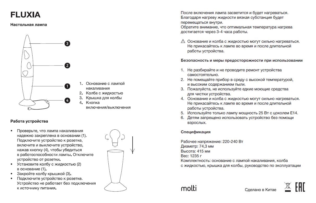 Fluxia — эффектная настольная лава-лампа. Декоративные светильники такого типа изобрел Эдвард Крэйвен Уолкер в 1960-х годах, и они до сих пор не теряют своей актуальности. Лампочка в корпусе подсвечивает колбу и одновременно нагревает цветную жидкость, которая начинает плавно подниматься и опускаться, причудливо переплетаясь и трансформируясь.