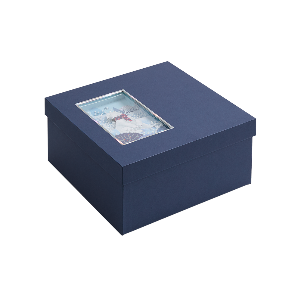Элегантная коробка из переплетного картона The Blue Bear станет настоящим украшением зимних праздников. Ее главная изюминка — очаровательное окошко с 3D-иллюстрацией, которое словно приглашает в мир новогодних чудес.