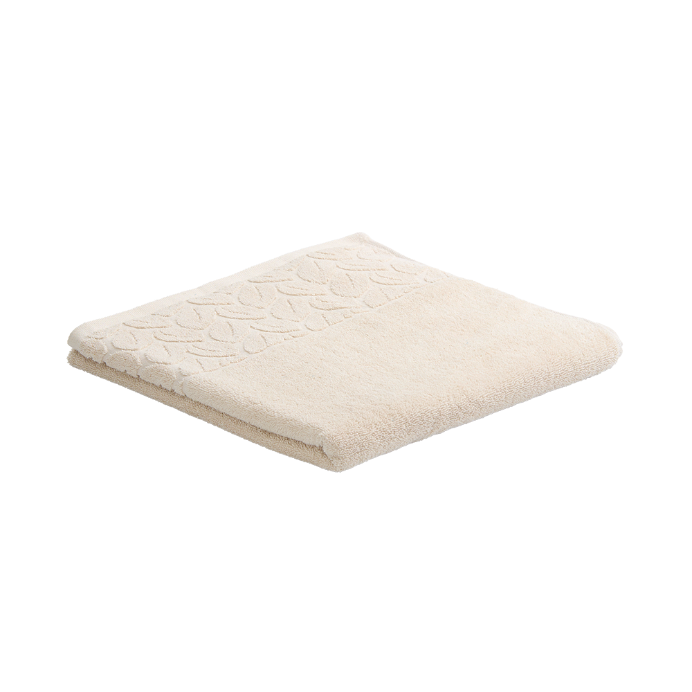 Светлые оттенки в сочетании с широким бордюром с рельефным растительным узором придают полотенцу элегантный и свежий вид.
