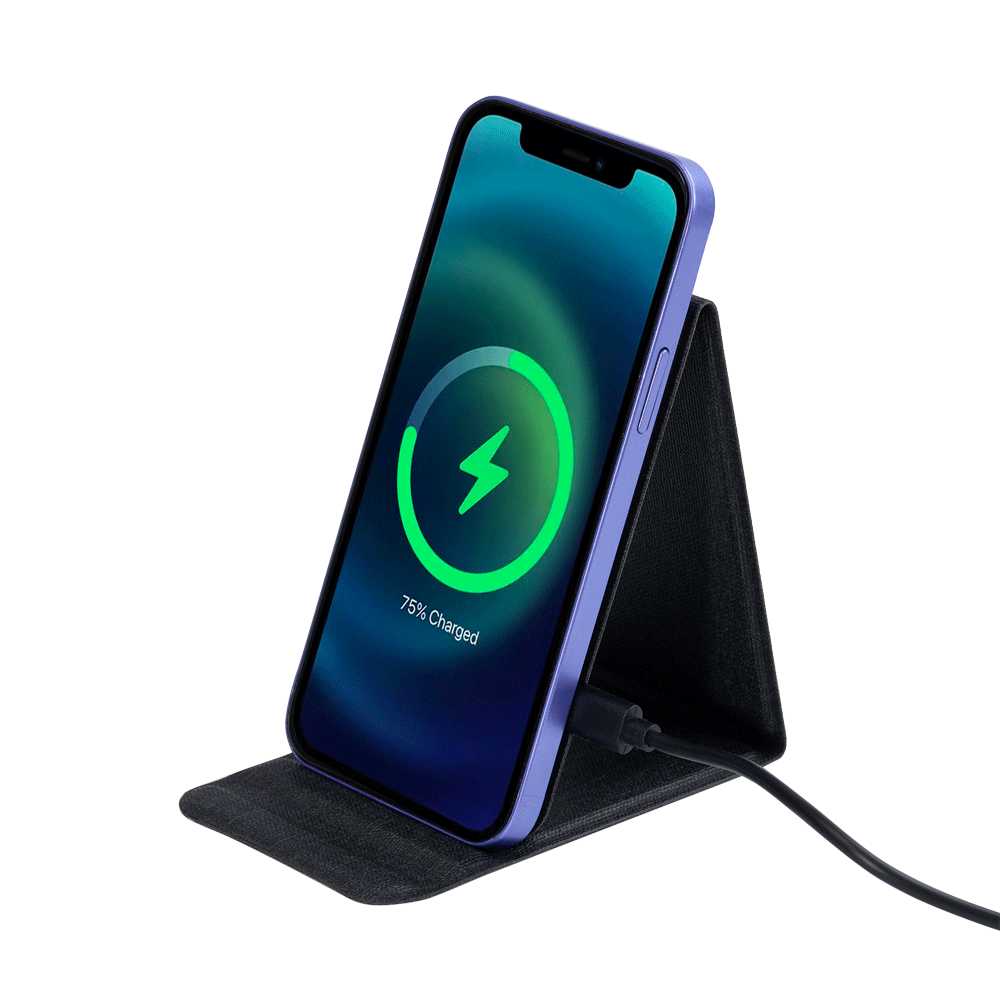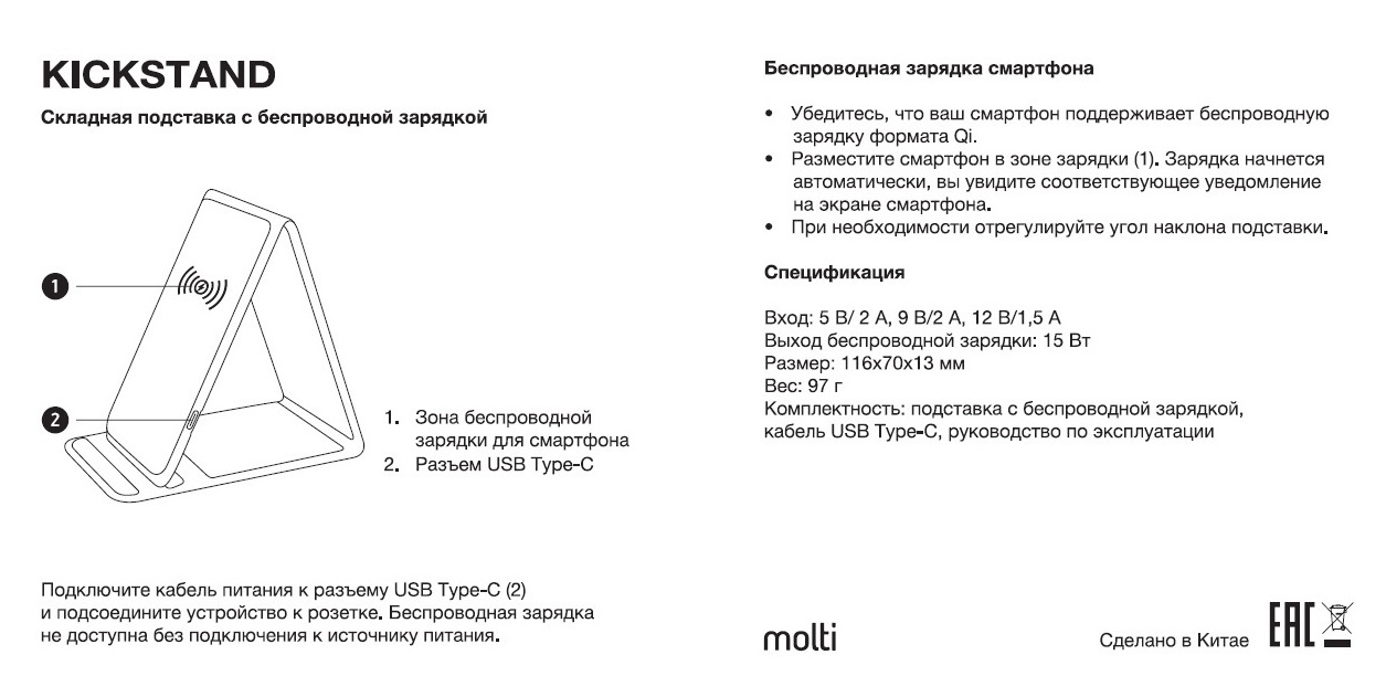 Kickstand — подставка для телефона c беспроводной зарядкой. Заряжать можно все смартфоны, поддерживающие технологию беспроводной зарядки Qi. Зарядка начнется автоматически при размещении устройства на индукционной площадке.