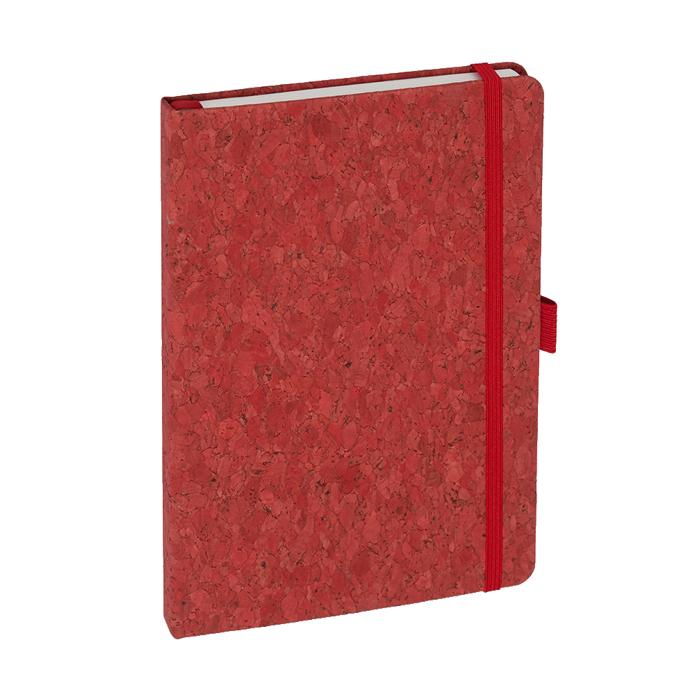 Блокнот с твердой обложкой из натуральной окрашенной пробки, дополнен петлей-резинкой для ручки, ляссе и резинкой в цвет обложки.