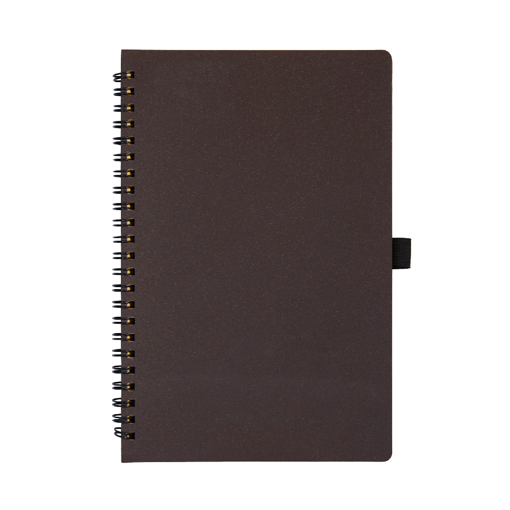 Блокнот на спирали из пластика и кофейного жмыха, дополнен резинкой для ручки.