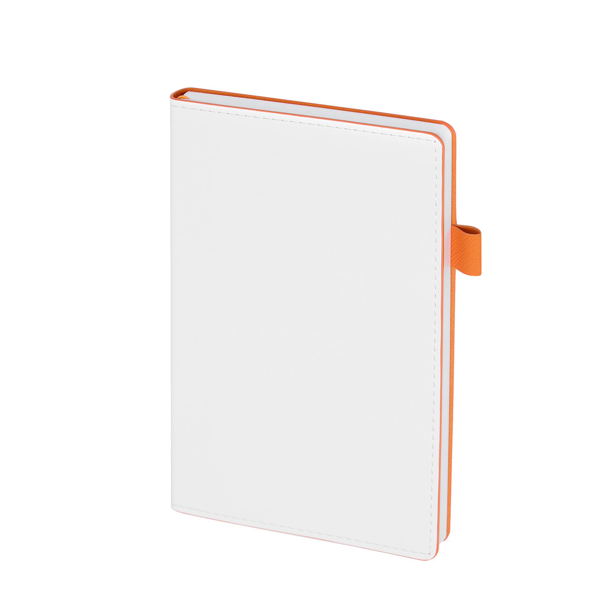 Гибкая обложка, материал обложки — Soft Touch, белый BB и Latte, оранжевый ОО; материал петли для ручки — Nice Touch, оранжевый ОО. Срез обложки окрашен в оранжевый цвет.