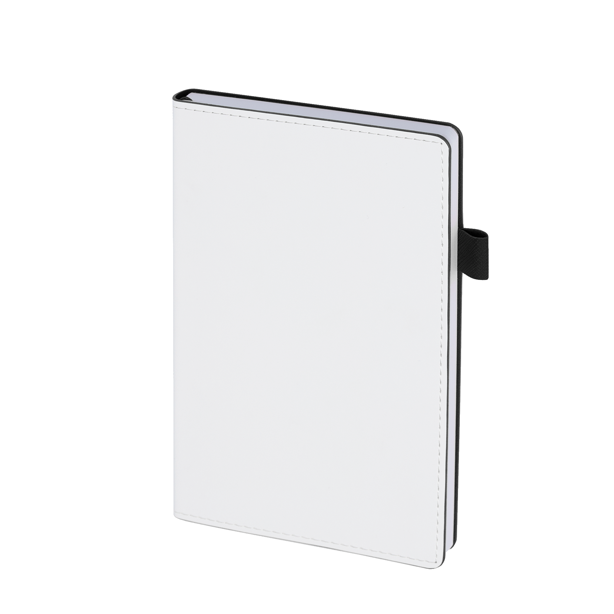 Гибкая обложка, материал обложки — Soft Touch, белый BB и Latte, черный АА; материал петли для ручки — Nice Touch, черный АА. Срез обложки окрашен в черный цвет.