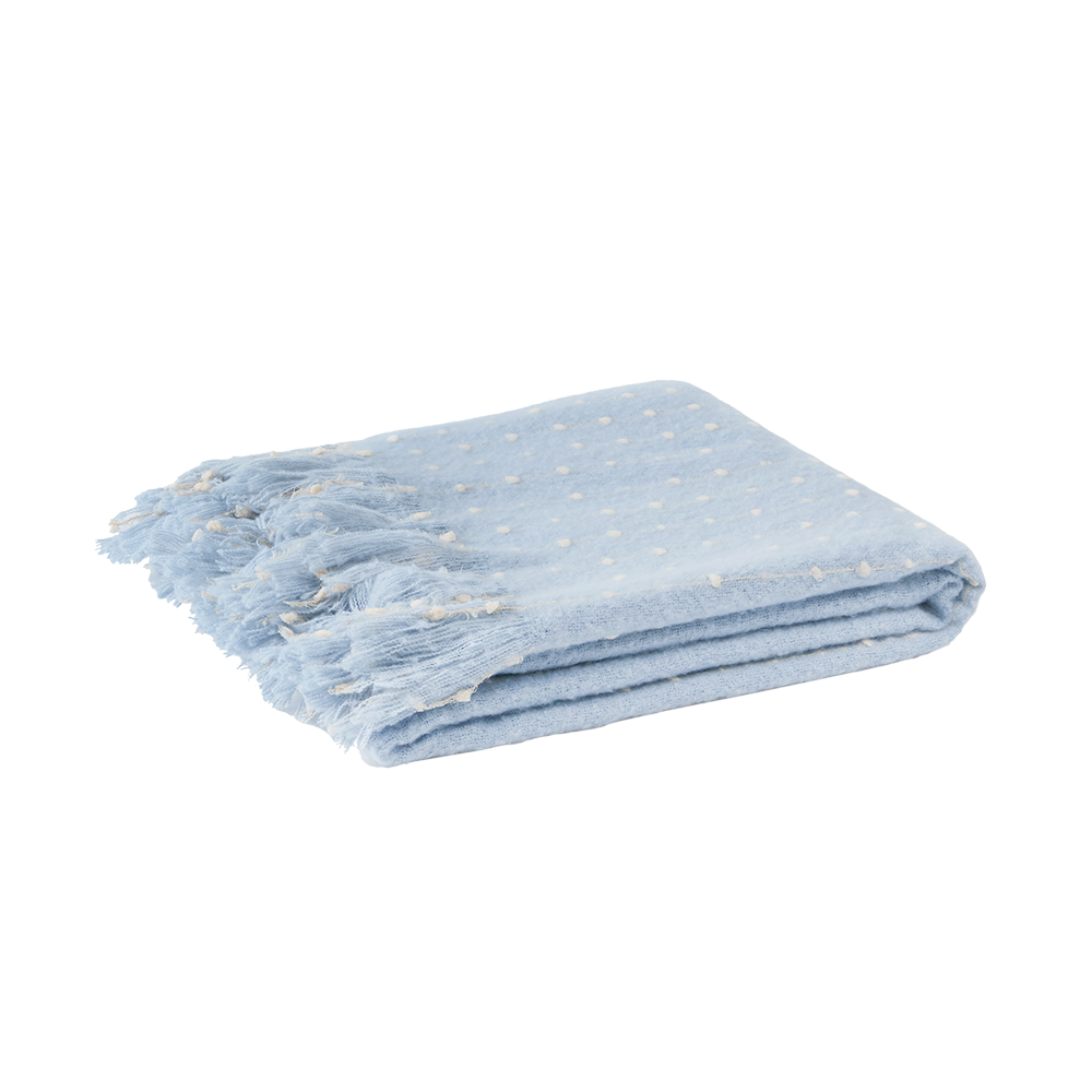 Изысканный плед небесно-голубого оттенка покоряет своим дизайном с первого взгляда. Особая текстура выпуклого узора в точку делает изделие не только визуально привлекательным, но и невероятно приятным на ощупь. Изящный пунктир, плавно переходящий на декоративную бахрому, придает пледу неповторимый шарм и элегантность.