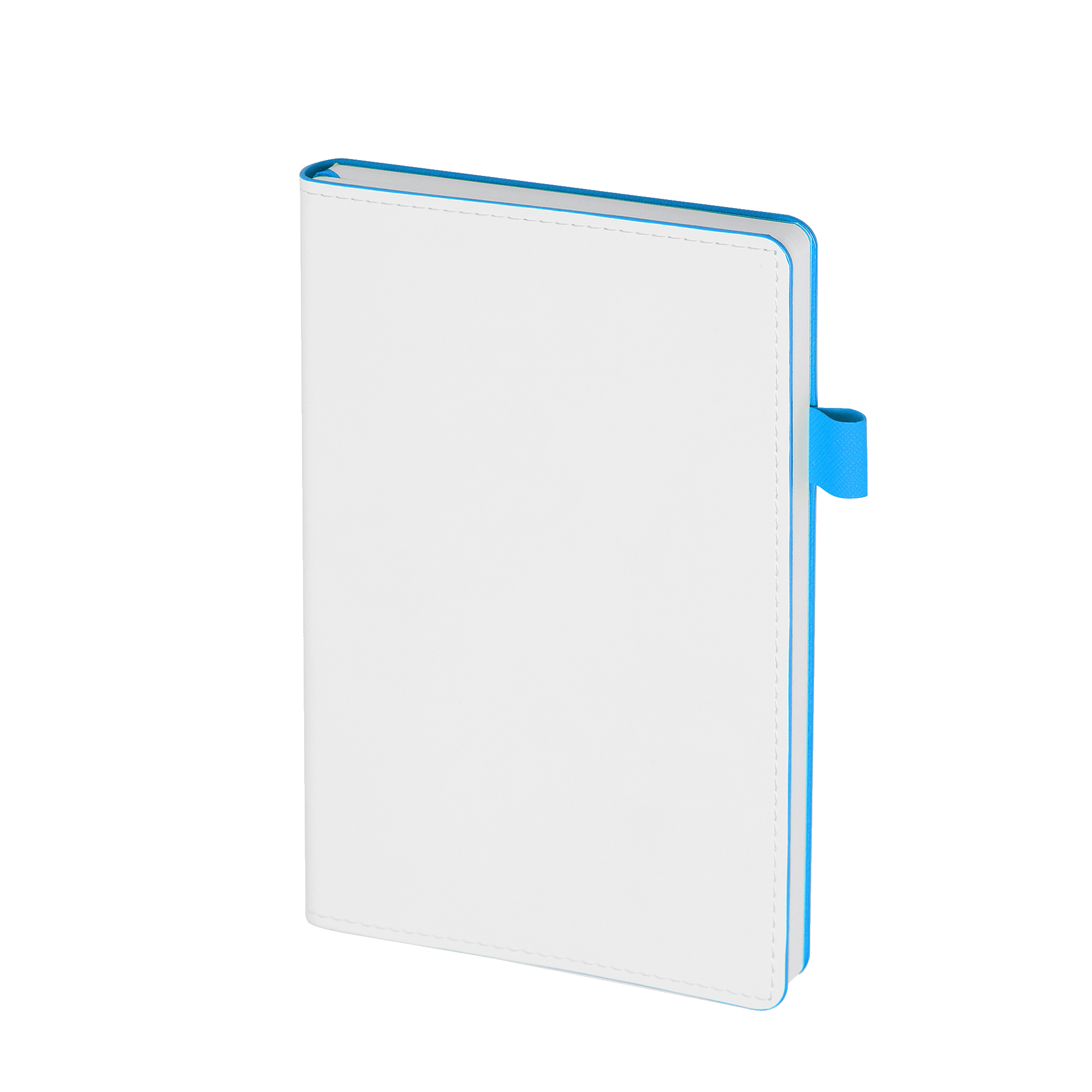 Гибкая обложка, материал обложки — Soft Touch, белый BB и Latte, голубойJJ; материал петли для ручки — Nice Touch, голубойJJ. Срез обложки окрашен в голубой цвет.
