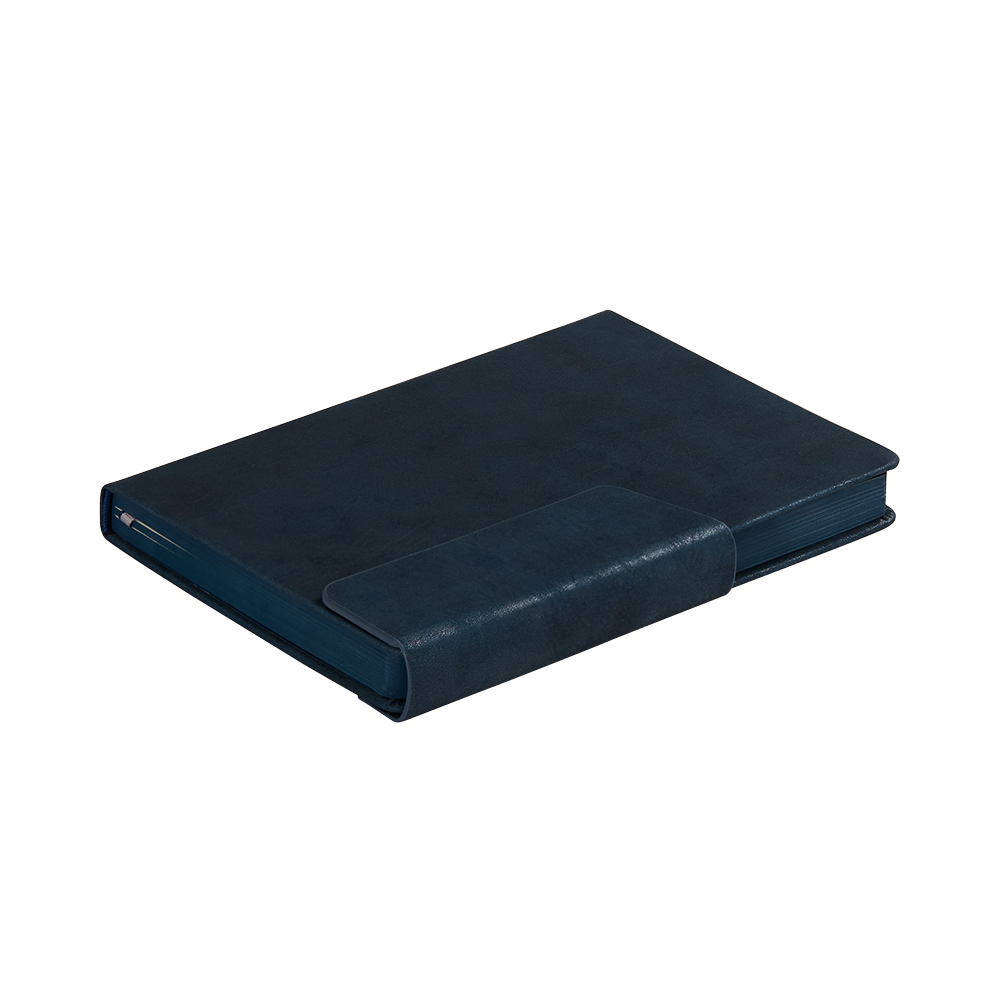 Ежедневник с твердой обложкой и фигурным магнитным клапаном, дополнен капталом и двойным ляссе.