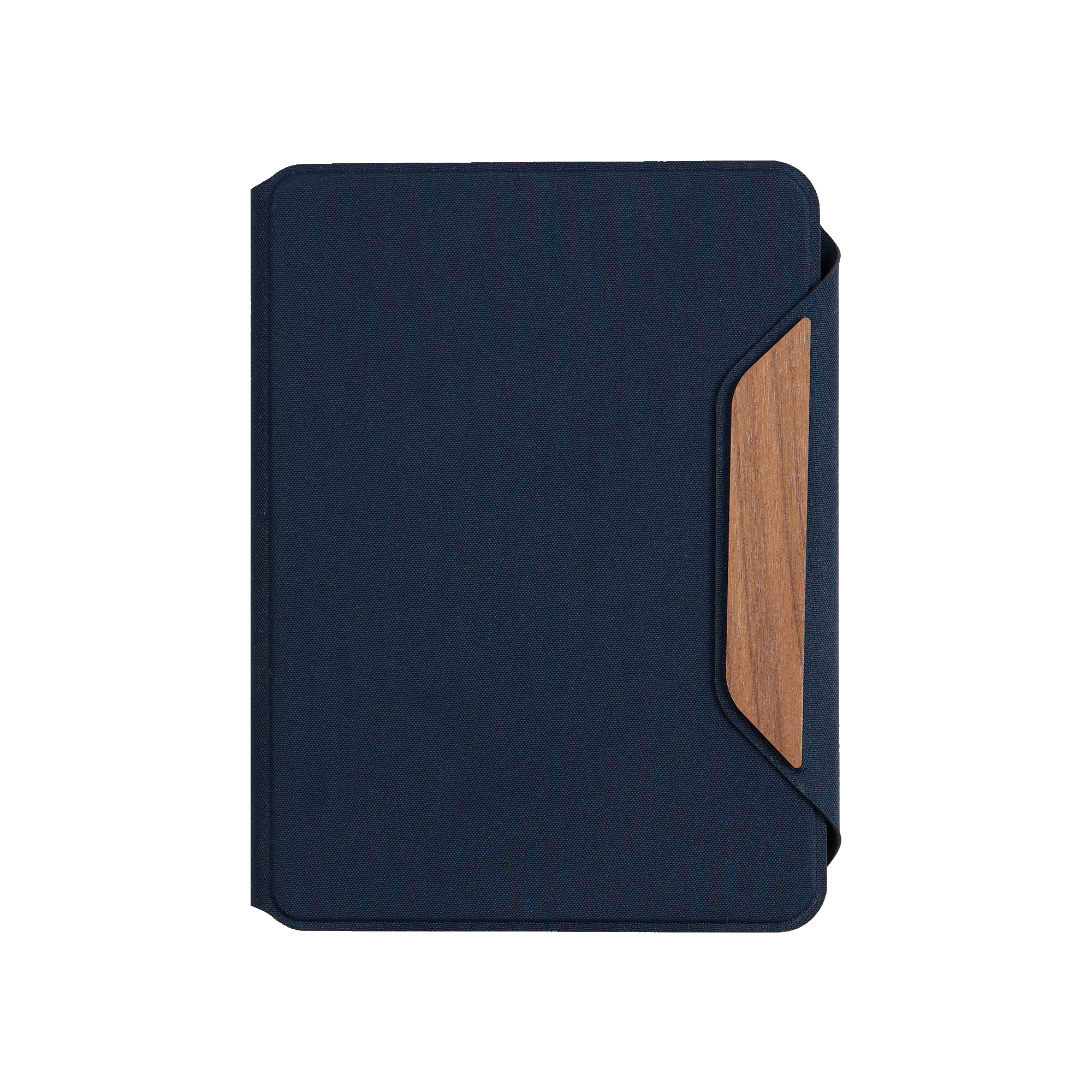 Обложка из ткани, на магнитной застежке с деревянной шильдой:
