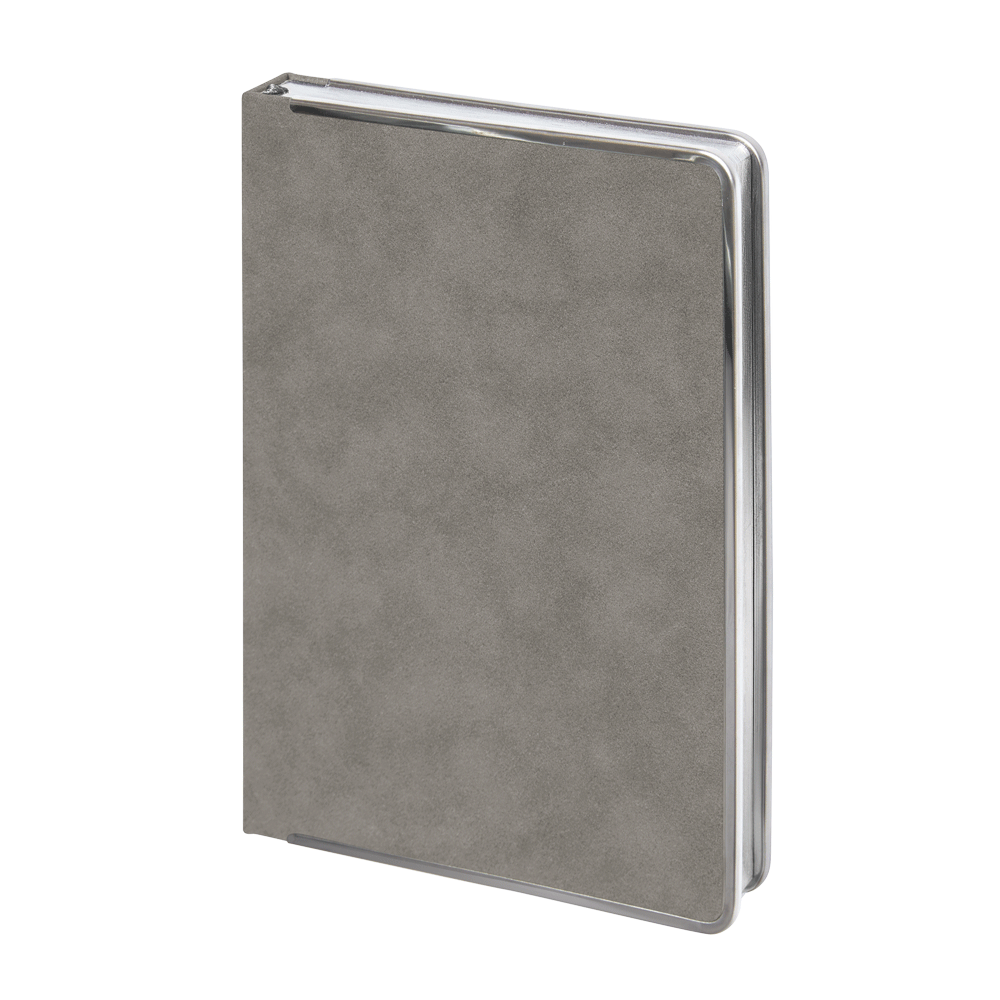 Ежедневник с твердой обложкой и серебристым обрезом блока. Выполнен из материала Nubuck, серый СС, дополнен серым ляссе и металлическими рамками с двух сторон обложки.