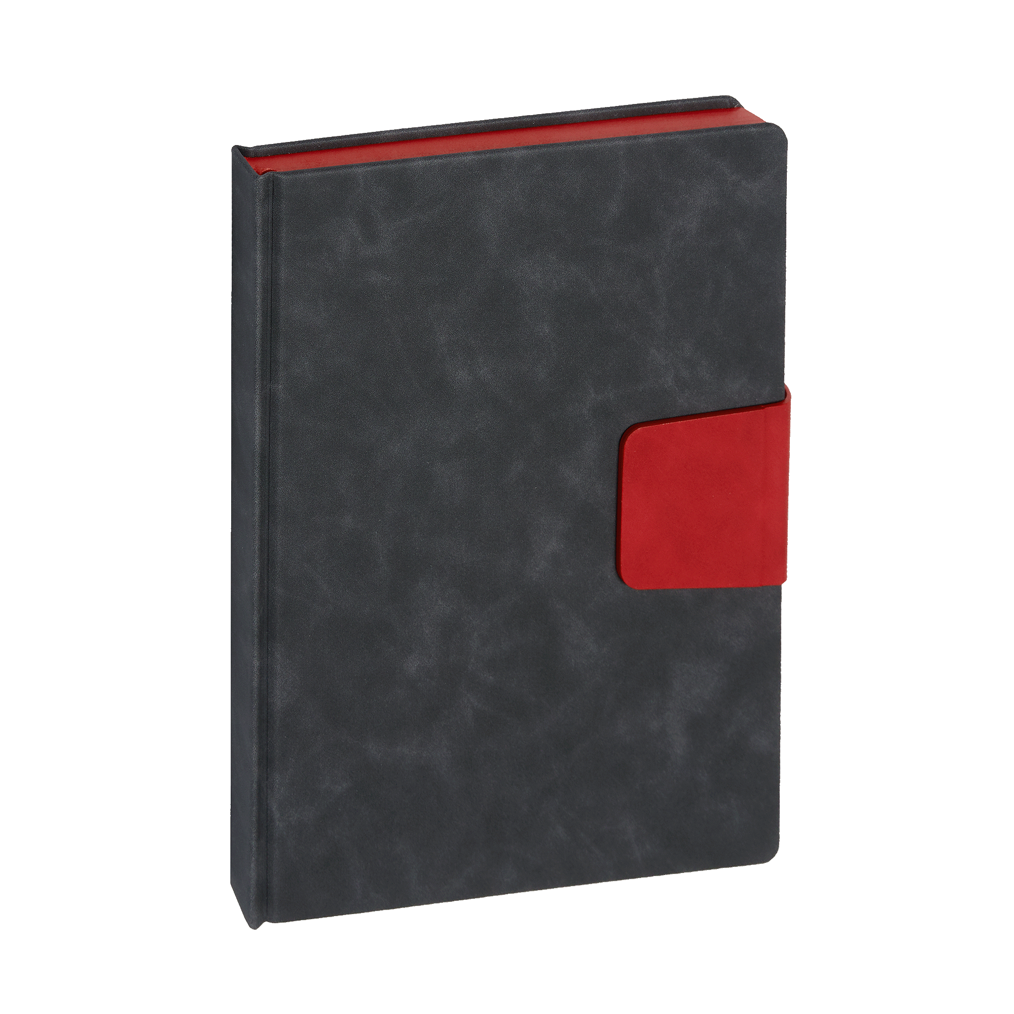 Ежедневник с твердой обложкой, выполнен из материала Nubuck Touch, черный АА, дополнен капталом, ляссе и обрезом красного цвета. Застежка — хлястик на магните из материала Nubuck Touch, красный РР.