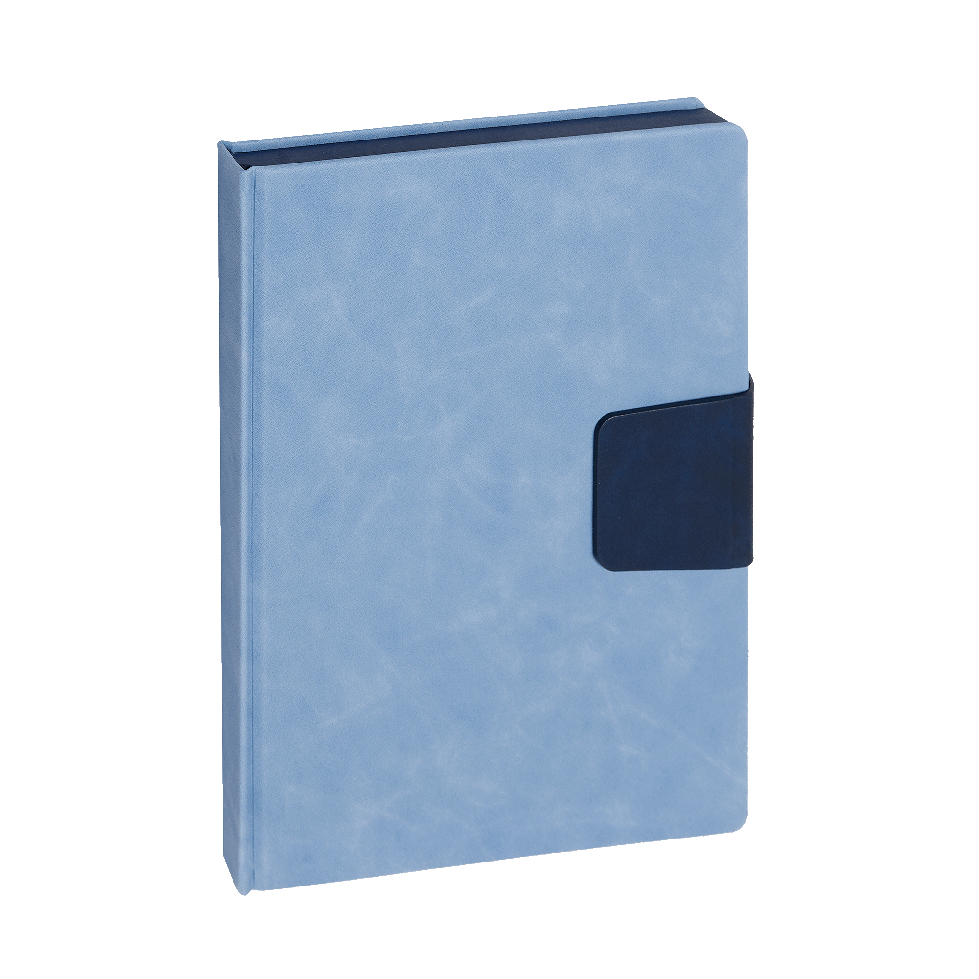 Ежедневник с твердой обложкой, выполнен из материала Nubuck Touch, голубой JJ, дополнен капталом, ляссе и обрезом синего цвета. Застежка — хлястик на магните из материала Nubuck Touch, темно-синий ХХ.