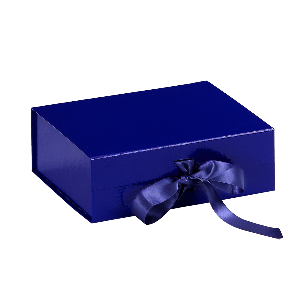 Коробка из переплетного картона с лайнером, ламинированым полуглянцевой текстурной пленкой и устойчивого к царапинам. Крышка на двух магнитах дополнительно фиксируется репсовой лентой.