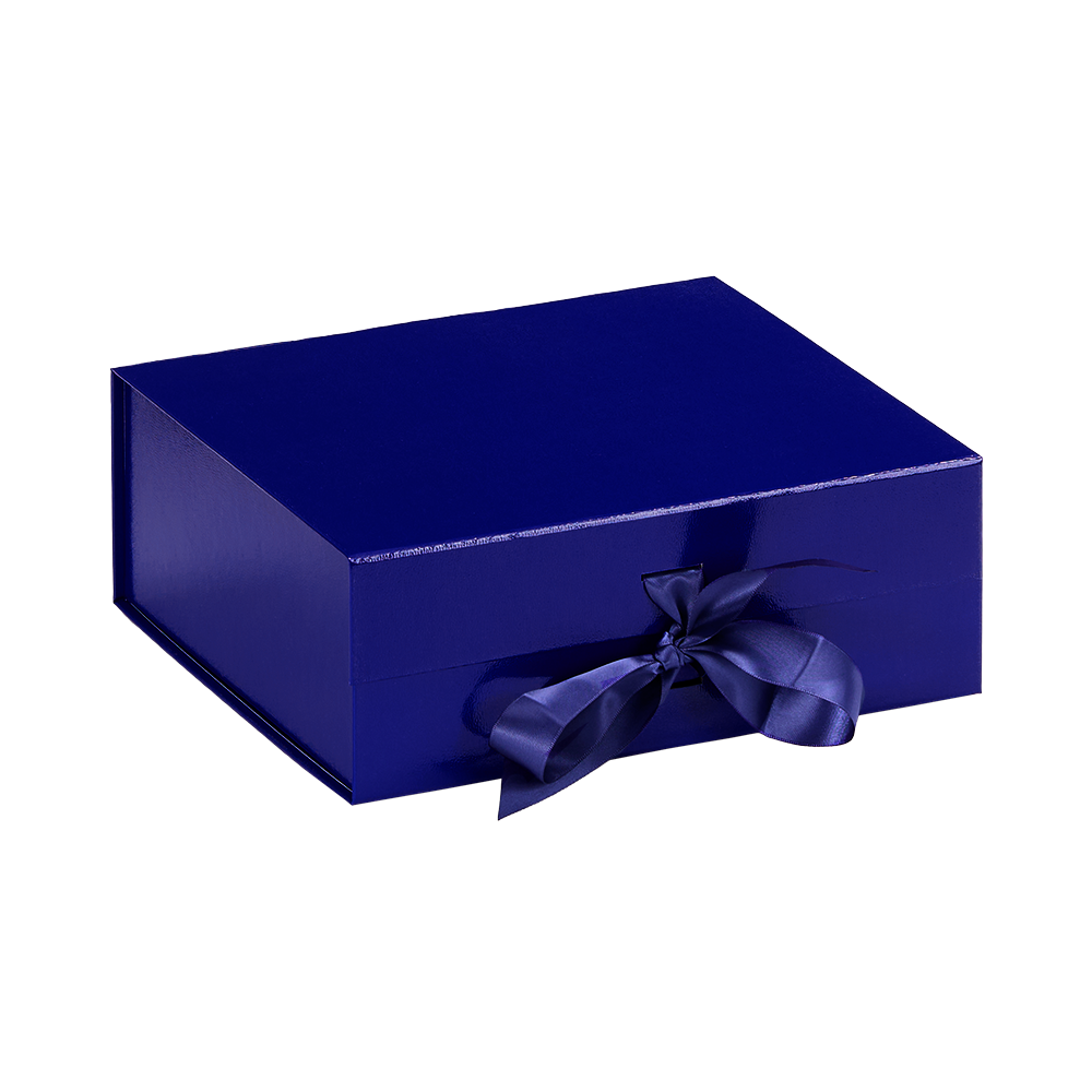 Коробка из переплетного картона с лайнером, ламинированым полуглянцевой текстурной пленкой и устойчивого к царапинам. Крышка на двух магнитах дополнительно фиксируется репсовой лентой.