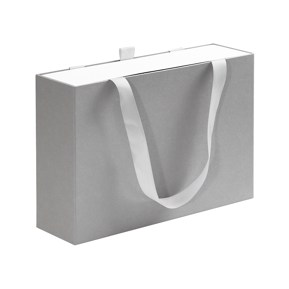 Внешний короб каширован дизайнерской бумаги и оснащен прочными ручками из репсовой ленты. Внутренний короб отделан белой бумагой, ламинированной матовой пленкой.