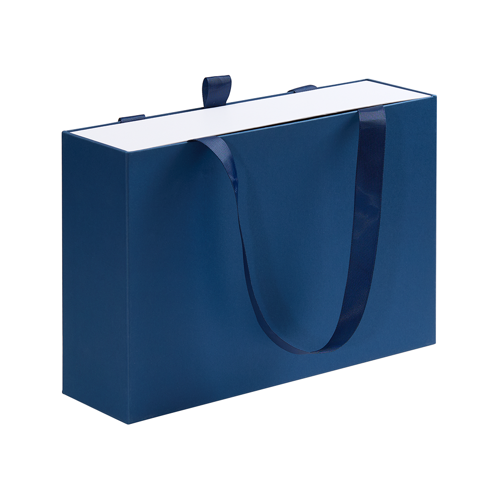 Внешний короб каширован дизайнерской бумаги и оснащен прочными ручками из репсовой ленты. Внутренний короб отделан белой бумагой, ламинированной матовой пленкой.