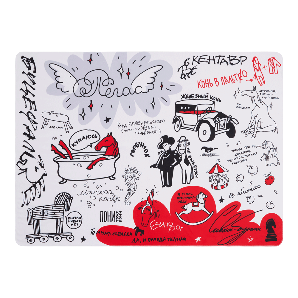 В чем только не участвовали эти грациозные скакуны: прокрадывались к троянцам, летали на Олимп, были любимчиками полководцев и господина Пржевальского. А еще почему-то кони любят надевать пальто, когда заявляются в гости. В общем, всех известных коней и их проделок, кажется, и не сосчитать. Но можно с удовольствием посетить несерьезный урок под названием «Коневедение» с этим оригинальным интерактивным пледом!