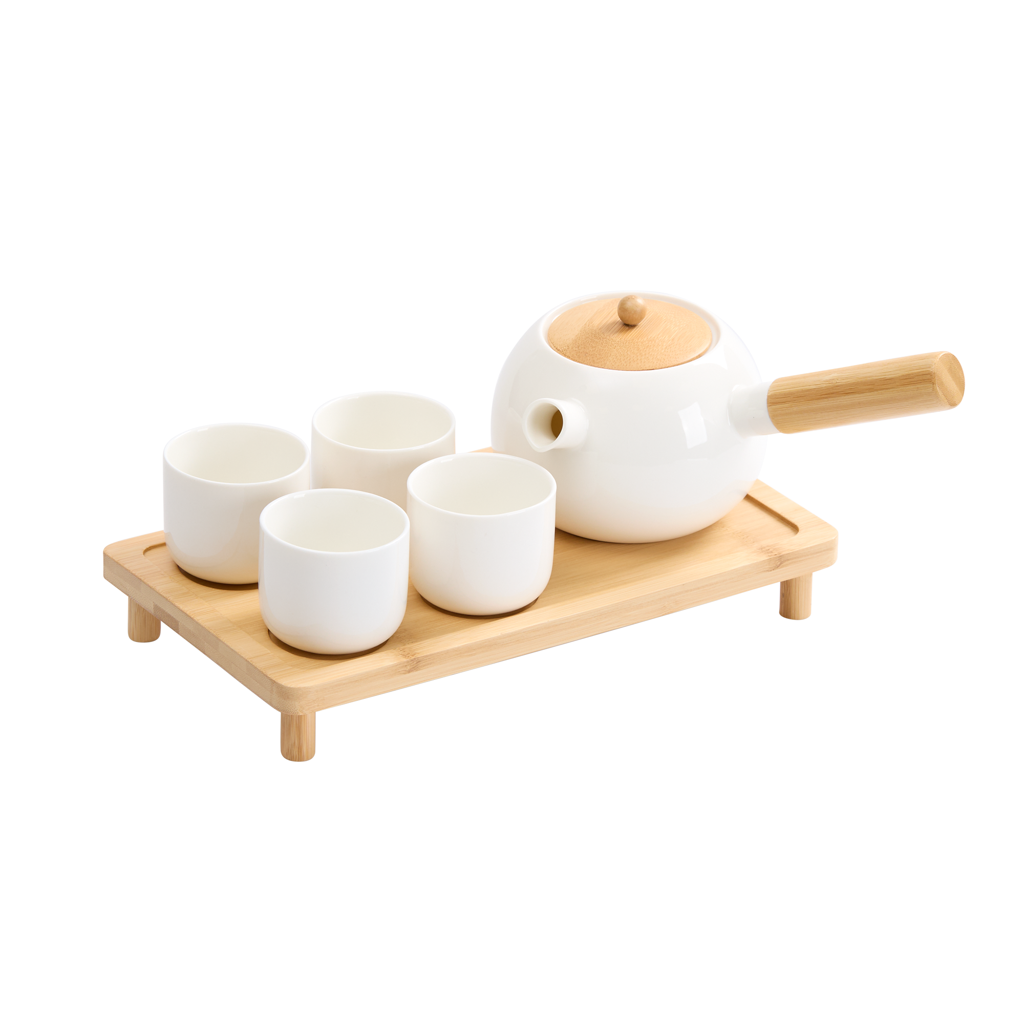 - Материалчайник, чашки - фарфор; поднос, крышка и ручка у чайника - бамбук