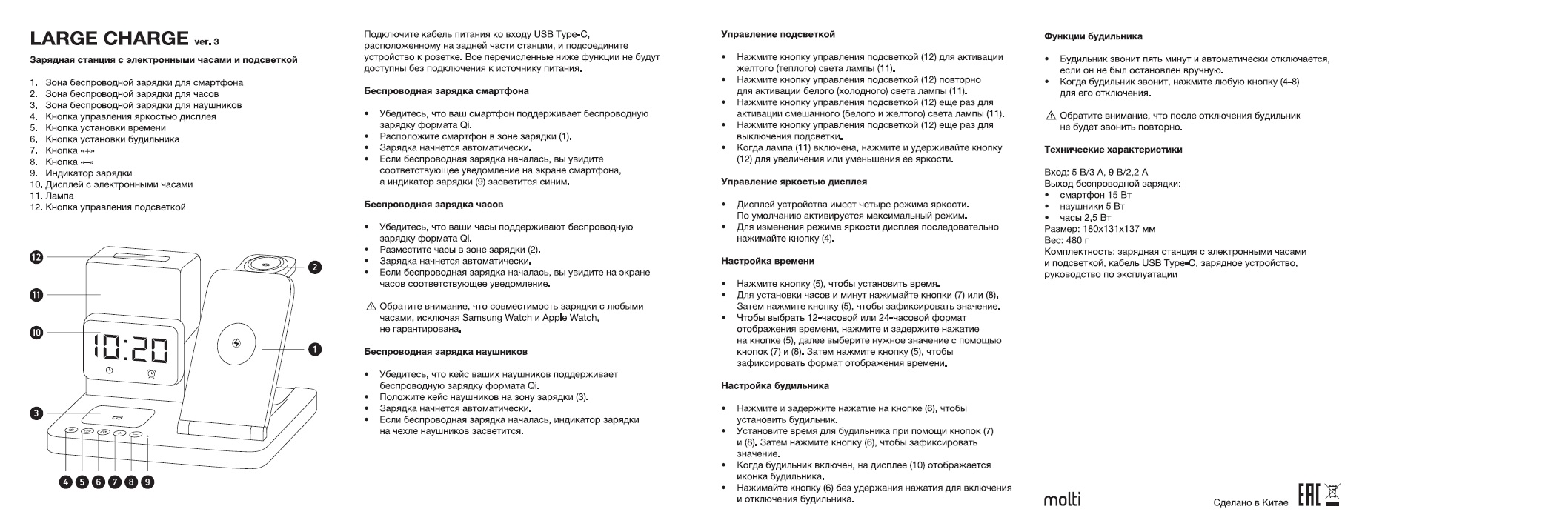 Large Charge — многофункциональное устройство, которое сочетает в себе функции станции для проводной и беспроводной зарядки разнообразных устройств, настольных часов с будильником и лампы.