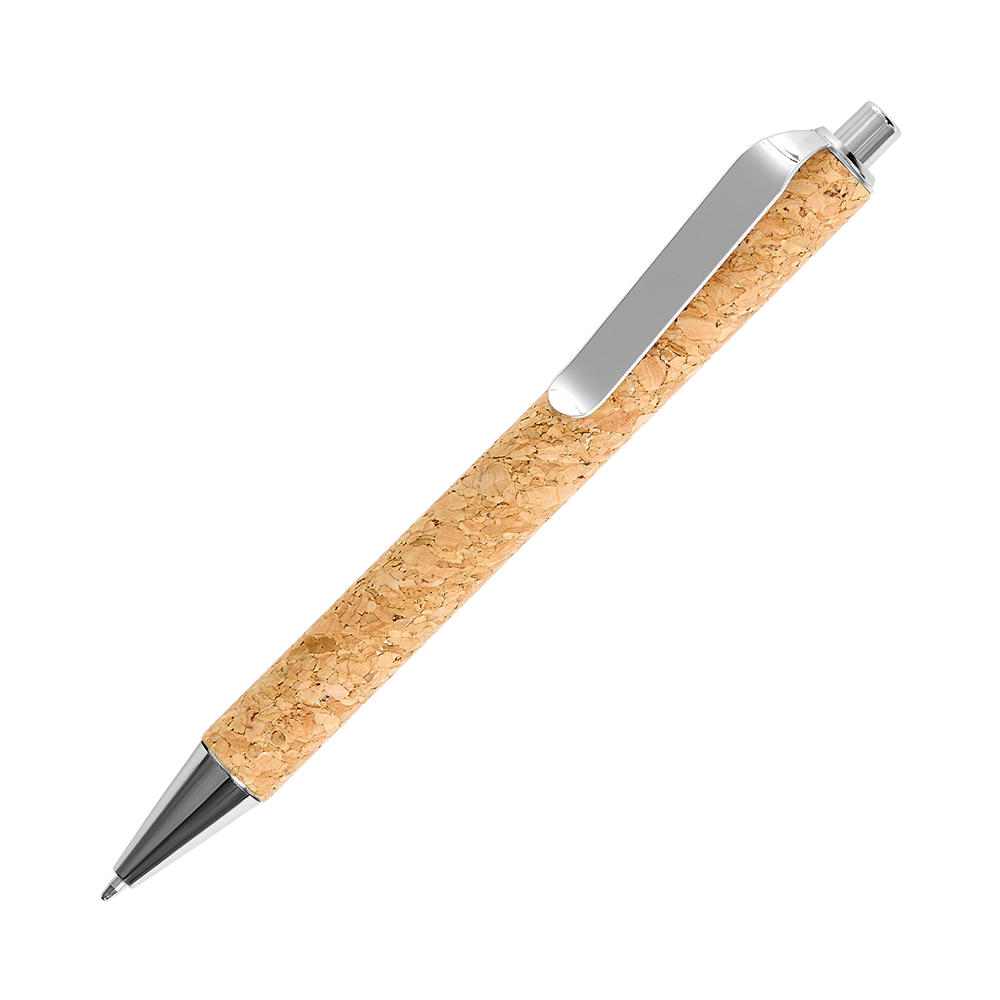 Шариковая ручка с корпусом из пробки крупной текстуры и широким металлическим клипом для нанесения логотипа.