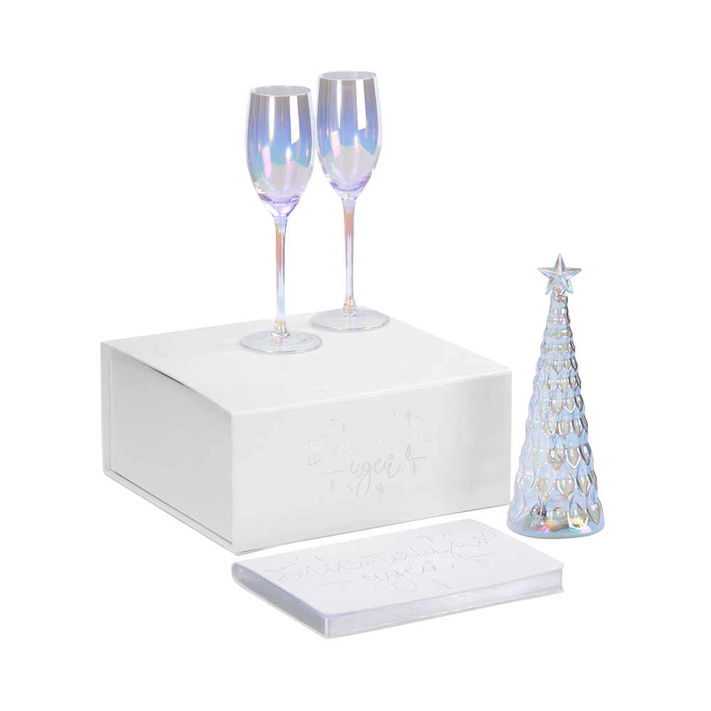 Секрет прост: это особенное перламутровое напыление бокалов и стеклянной елочки-светильника, а еще серебристое голографическое тиснение на самой упаковке и ежедневнике с главным — и всегда актуальным — пожеланием. В такой компании блестящие идеи, без сомнения, будут посещать намного чаще, чем обычно, а весь год будет окрашен в яркие тона, искрящиеся радостью!