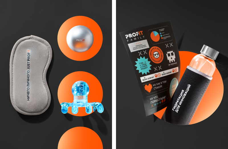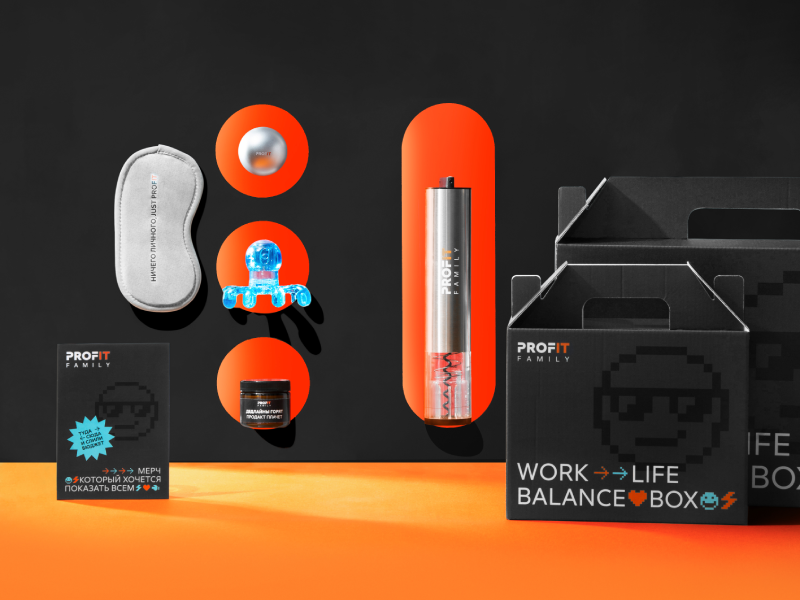 Уже на первой встрече рабочей группы стало понятно: команда клиента молодая, веселая, не чуждая острых подколов в общении друг с другом и очень увлеченная своим делом. Это вдохновило Arnika gifts design создать своего рода мем-паки, которые бы отражали особую рабочую атмосферу PROF-IT GROUP и интересы сотрудников. Получилось два вида подарков: бокс work-life balance, напоминающий о важности жизненной гармонии, и универсальный набор базового мерча.