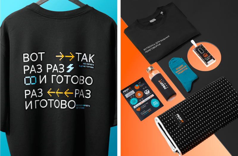 Опираясь на брендбук клиента и предпочтения ЦА, основным цветом мерча выбрали черный, добавив яркие пикселизованные иконки. Сеты собраны из простой актуальной продукции, которая используется каждый день, и дополнены вещами с релакс-характером. Футболка, носки, плед, аккумулятор, бутылка для воды, стикерпак сочетаются с массажером, штопором, маской для сна, аромасвечой и антистрессом. Упаковкой стали индивидуальные коробки с полной запечаткой. Текстиль кастомизировали брендированными бирками.