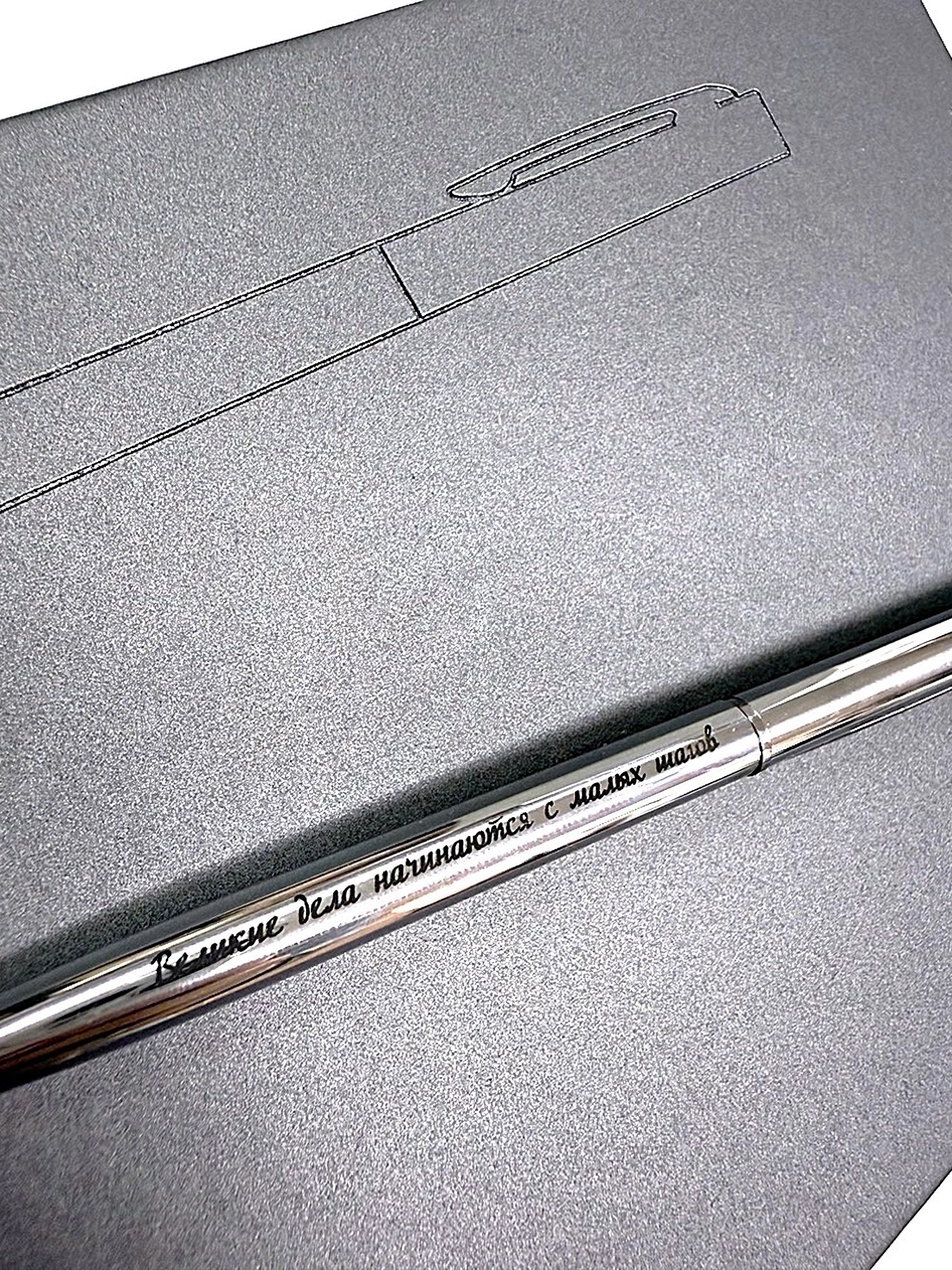 Для баланса сет довершает офисная классика — ежедневник Magnet Shall с тиснением и ручка Hotel Ferra с гравировкой мотивирующего копилайна на корпусе: «Великие дела начинаются с малых шагов». Благодаря магниту в обложке ежедневника эта пара всегда будет единым целым.