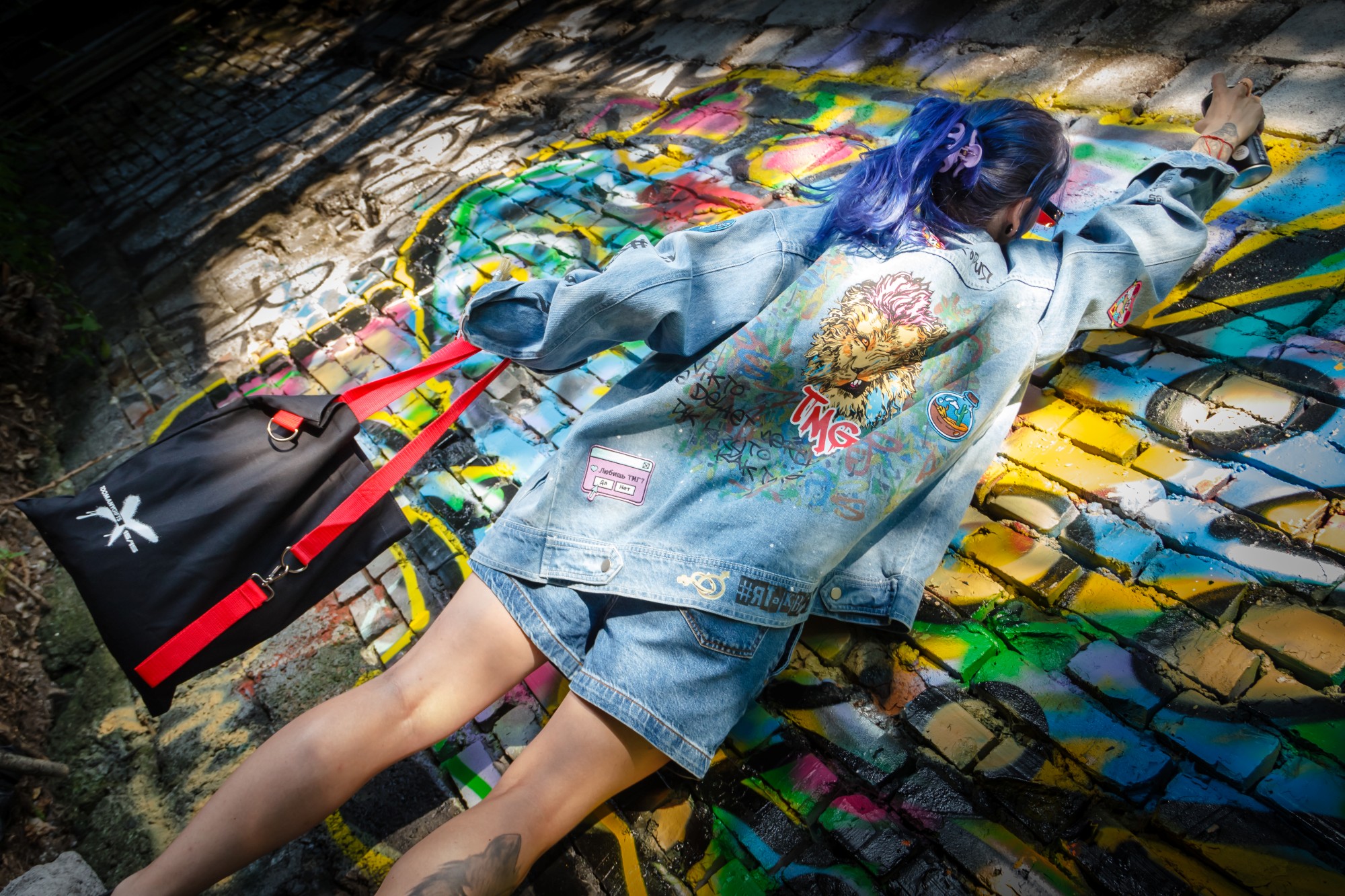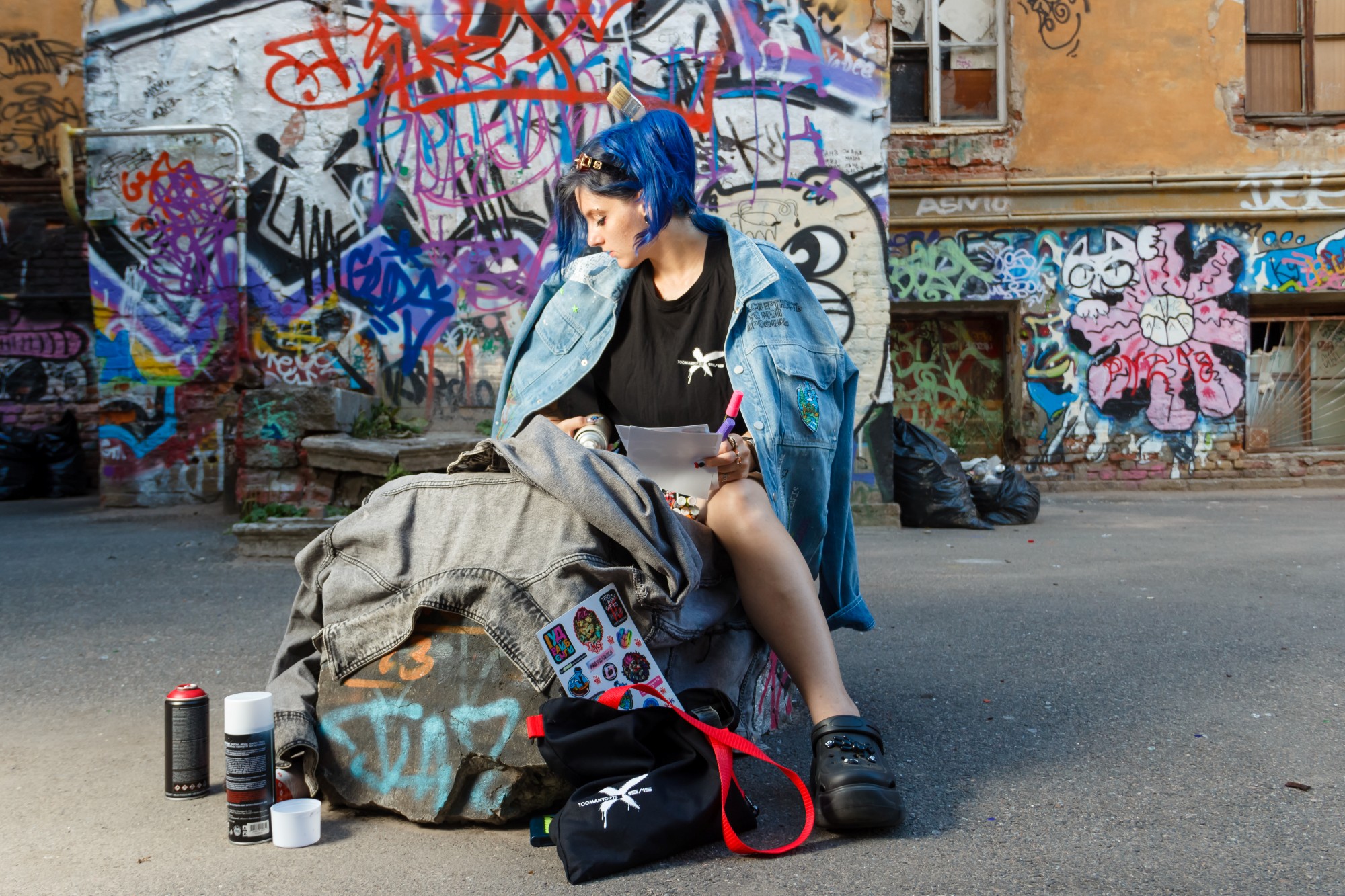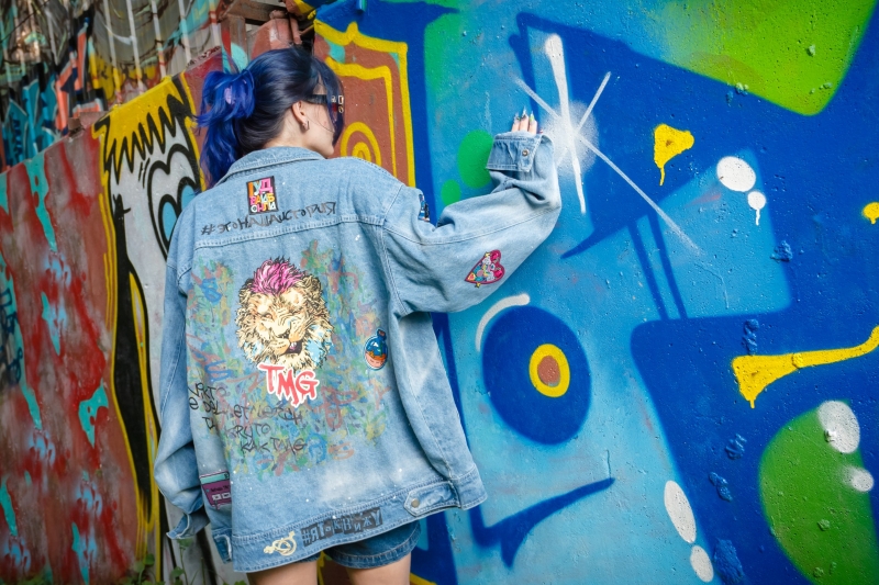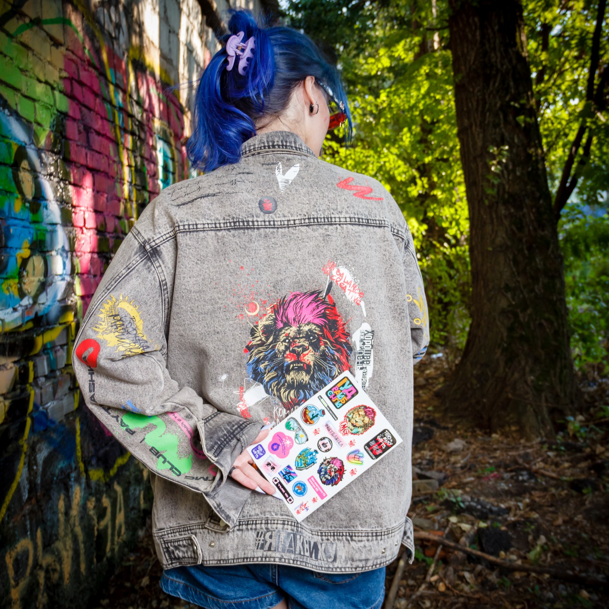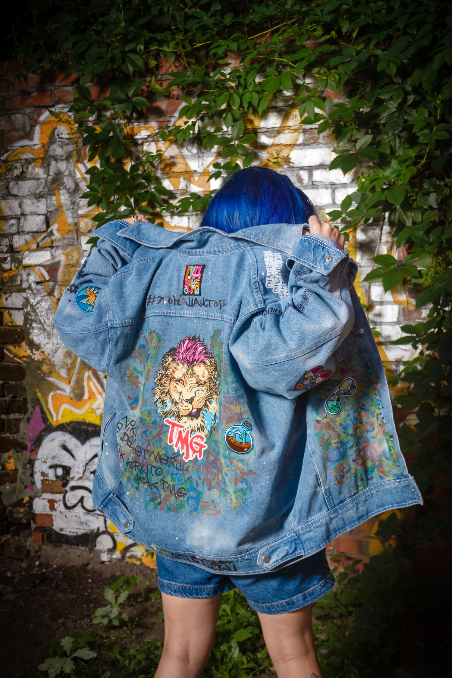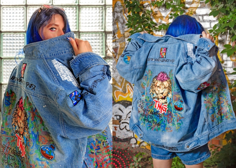 На разных сторонах джинсовки «разбросаны» классные яркие послания в виде принтов и элементов кастомизации, а фон расписан аэрозольной краской в стиле граффити, будто куртка на мгновение стала стеной арт‑квартала.