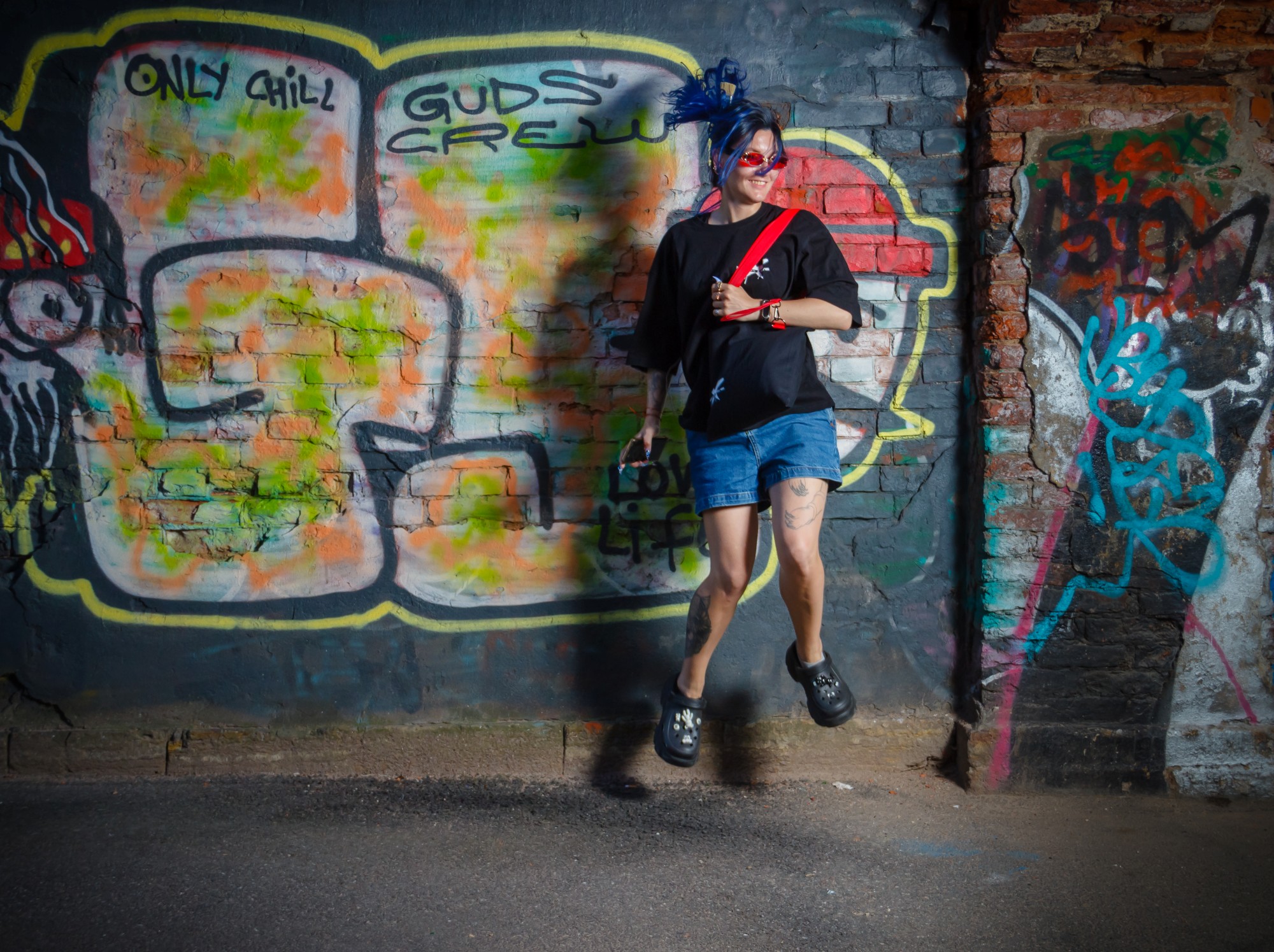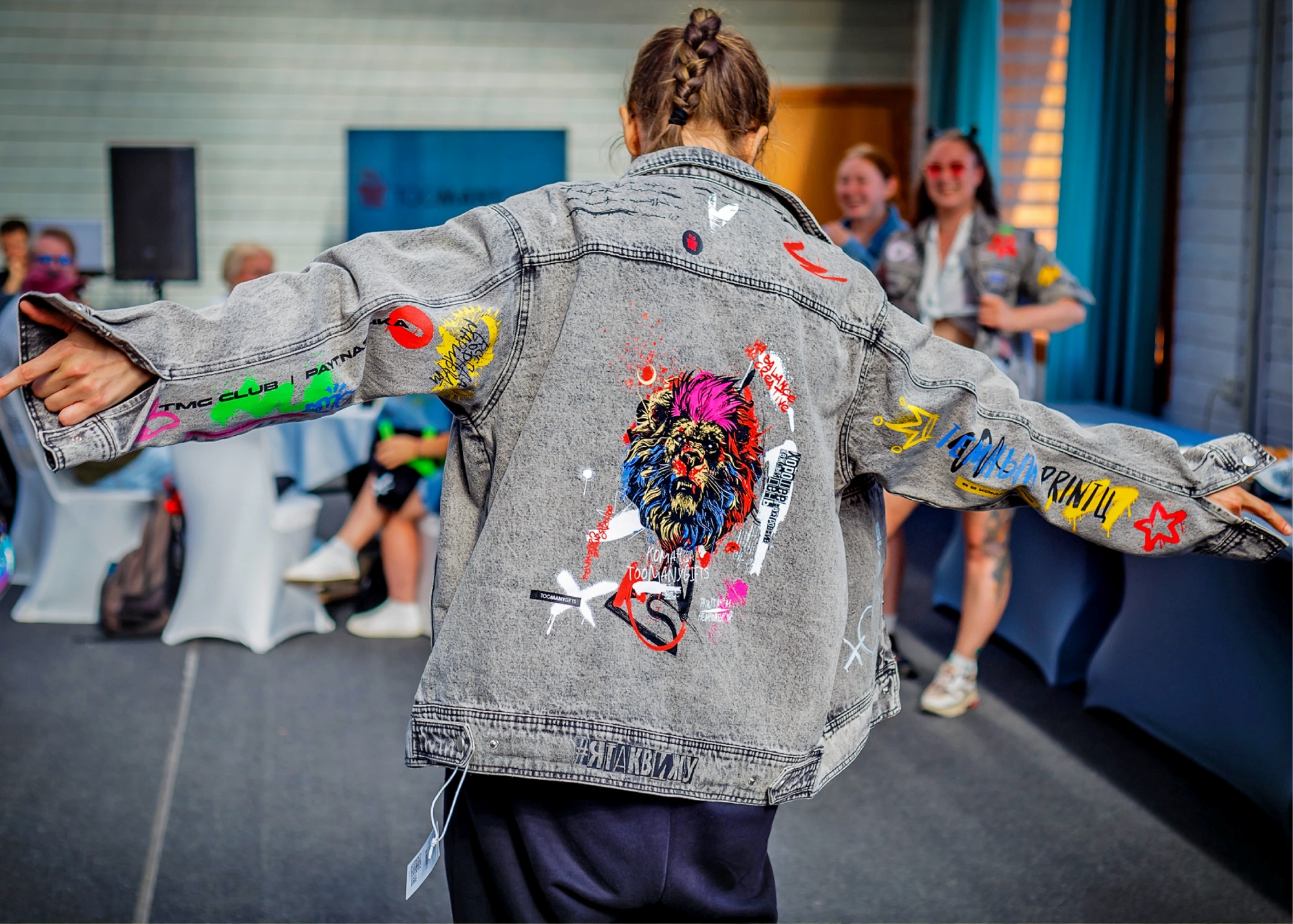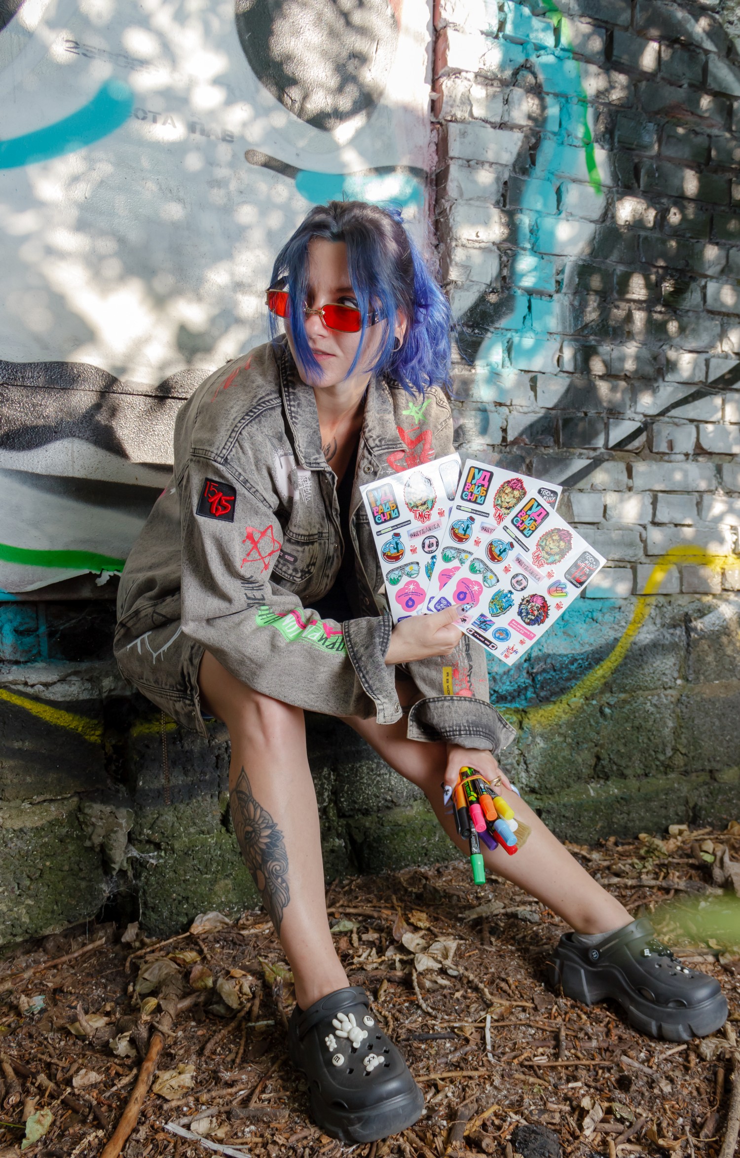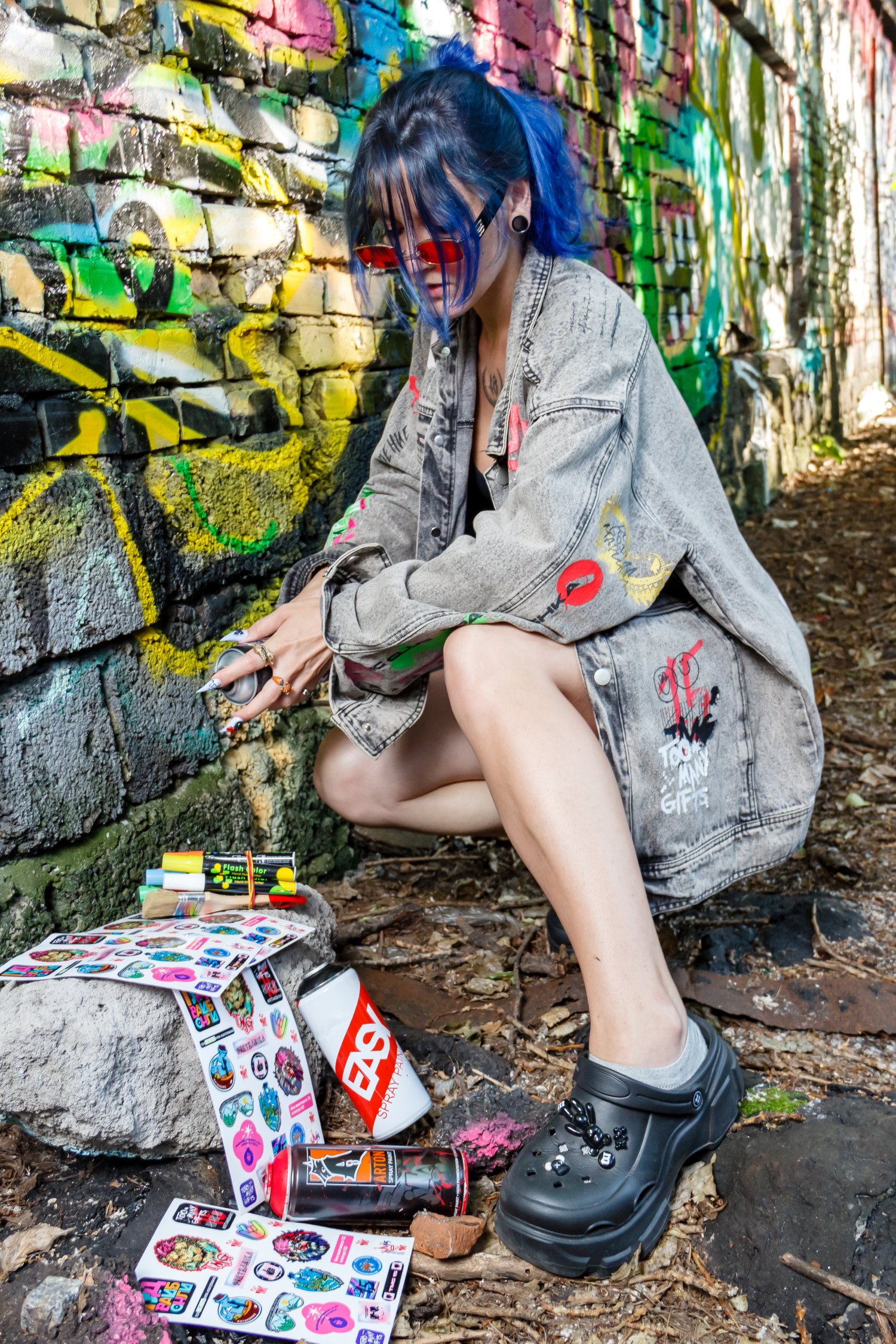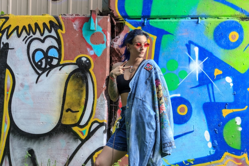 На разных сторонах джинсовки «разбросаны» классные яркие послания в виде принтов и элементов кастомизации, а фон расписан аэрозольной краской в стиле граффити, будто куртка на мгновение стала стеной арт‑квартала.