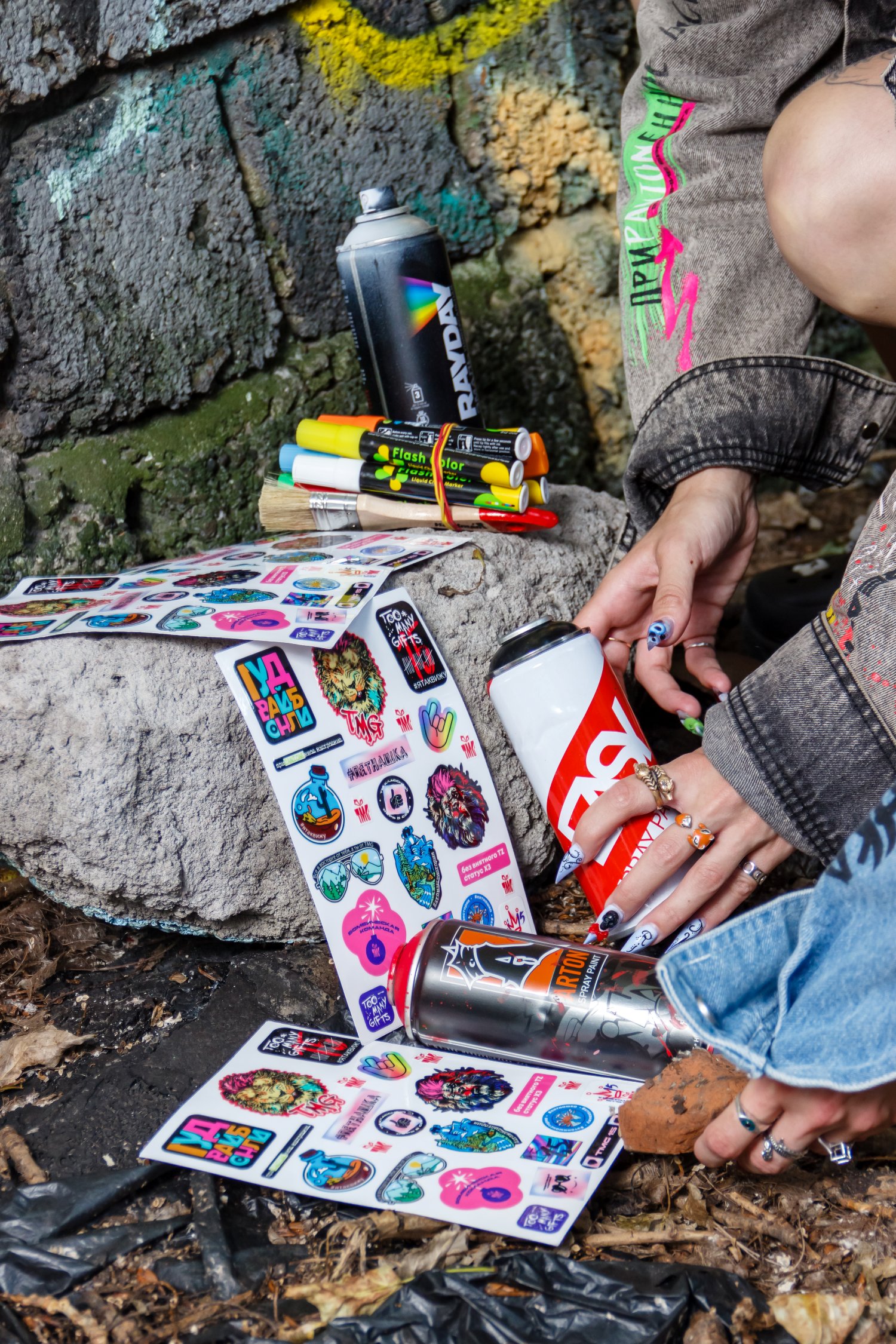 - Шелкография и краска из баллончиков — для нанесения графичных элементов сочных цветов.