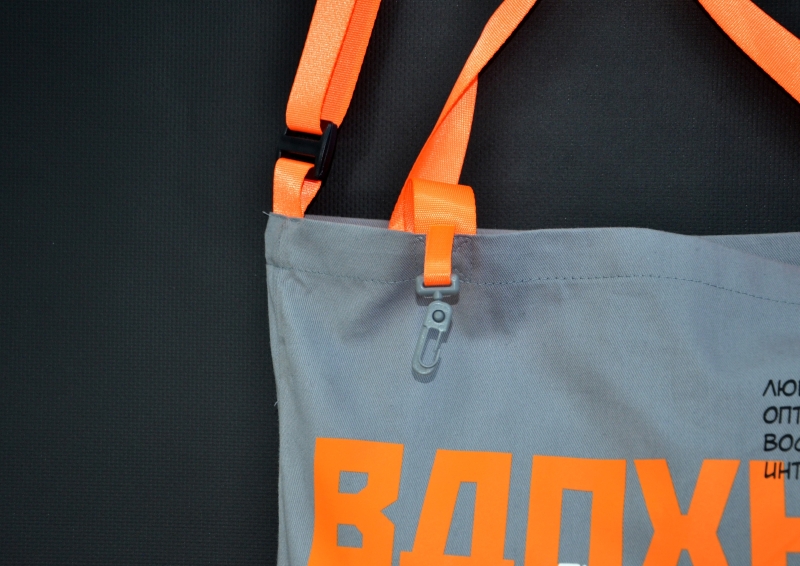 - шопер на основе бланковой модели B4 с масштабным нанесением ключевых слоганов методом полноцветного трансфера (DTF), кастомизированный двойными лямками в тон основного принта, карабином и контрастной черной пряжкой.