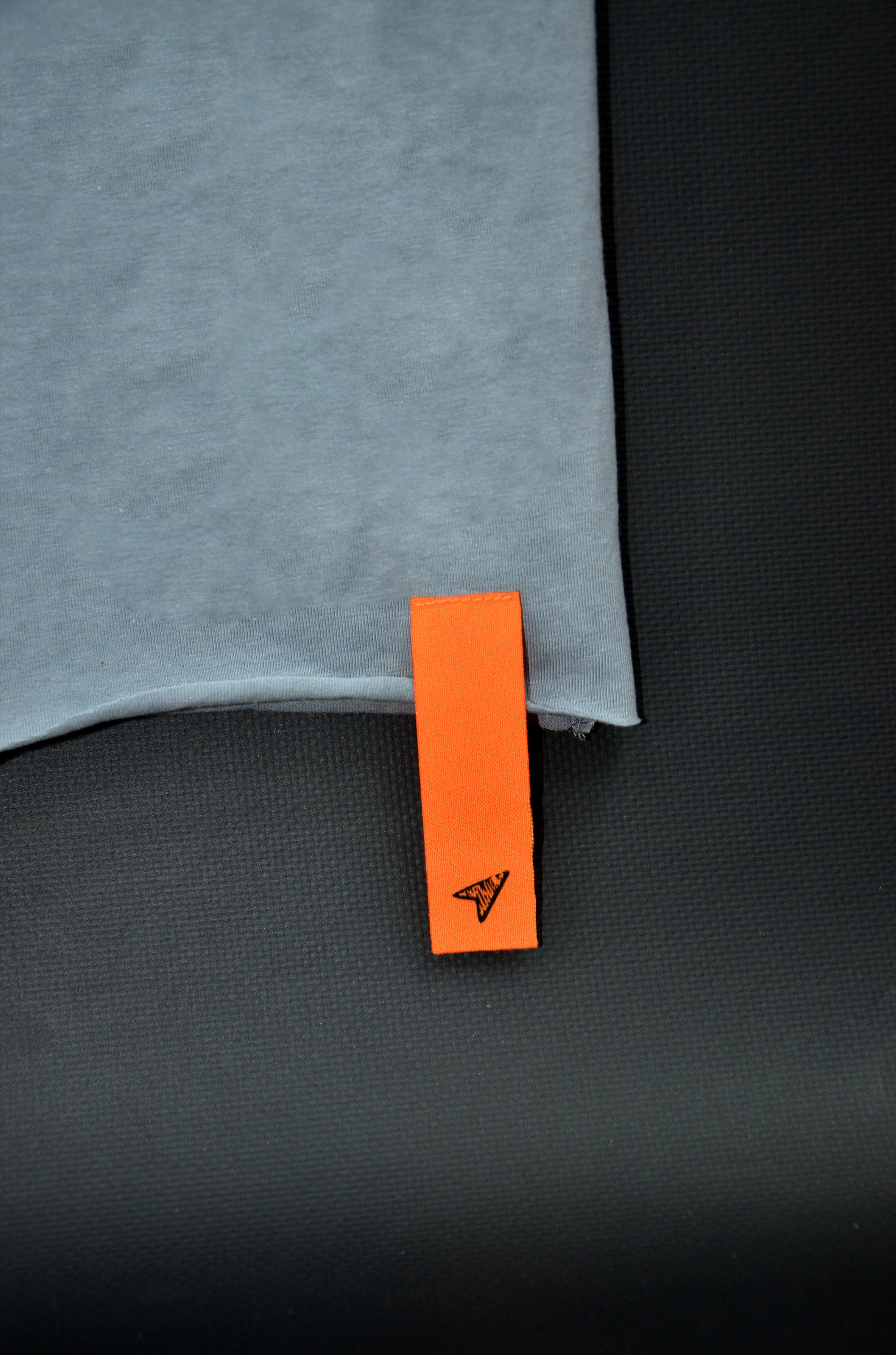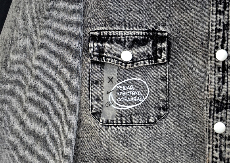 - серая джинсовая куртка О3 с лаконичным нанесением надписи (DTF) и силиконовой лентой на кармане, а также прозрачным лейблом с УФ-печатью;