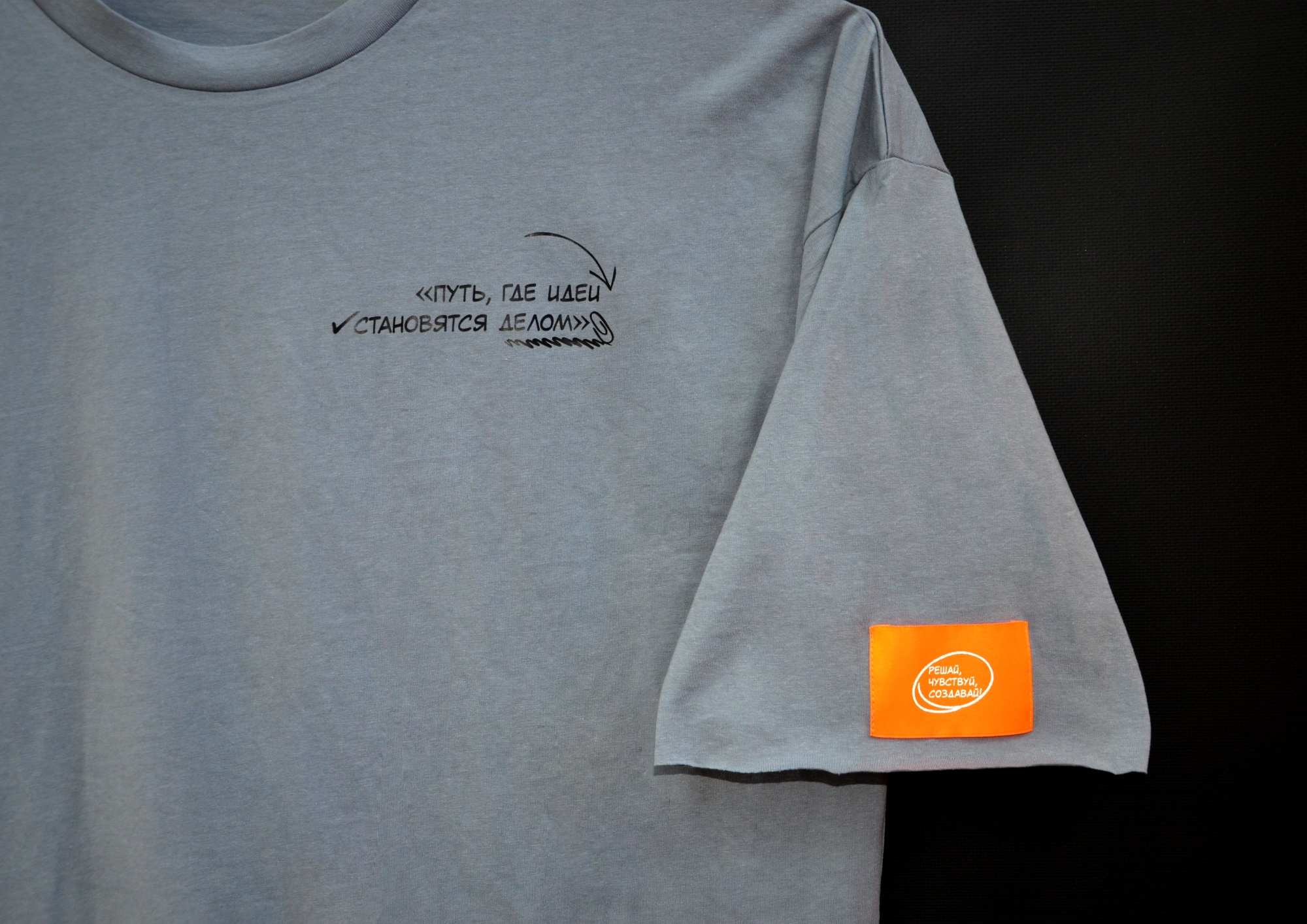Важнейшим элементом стала футболка Т1 бренда andor. Вместо стандартного размещения логотипа команда выбрала нанести с разных сторон фразы‑манифесты. Надписи «Путь, где идеи становятся делом», «Решай, чувствуй, создавай» или позитивные слова-теги превращаются в личные заявления владельца, а футболка становится носителем идей.