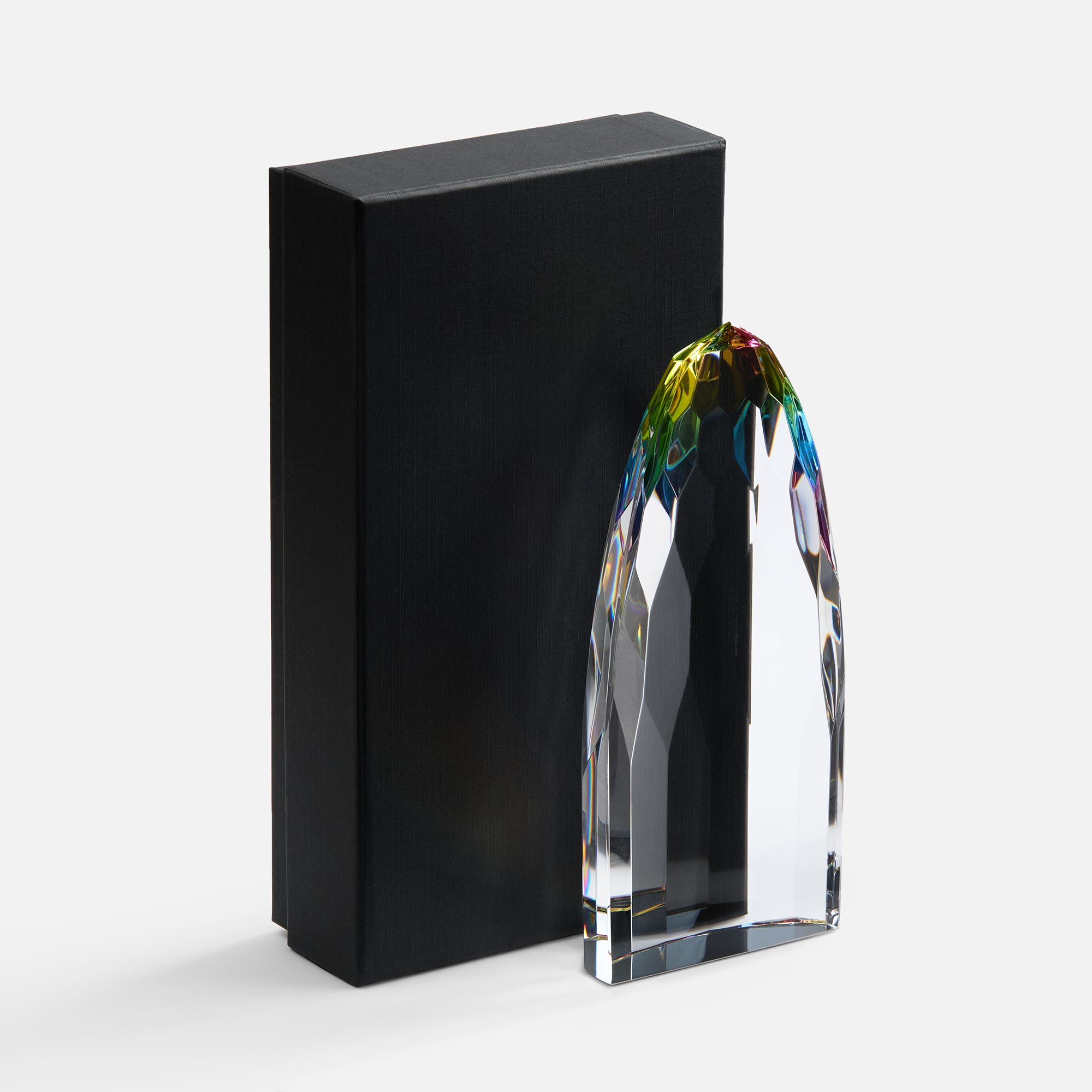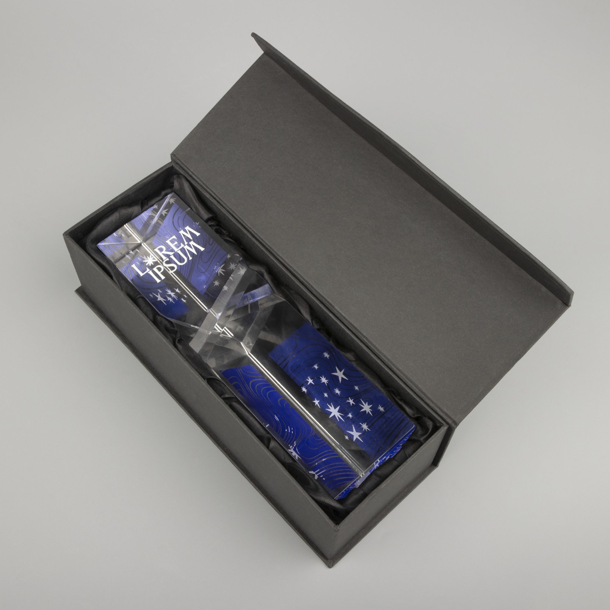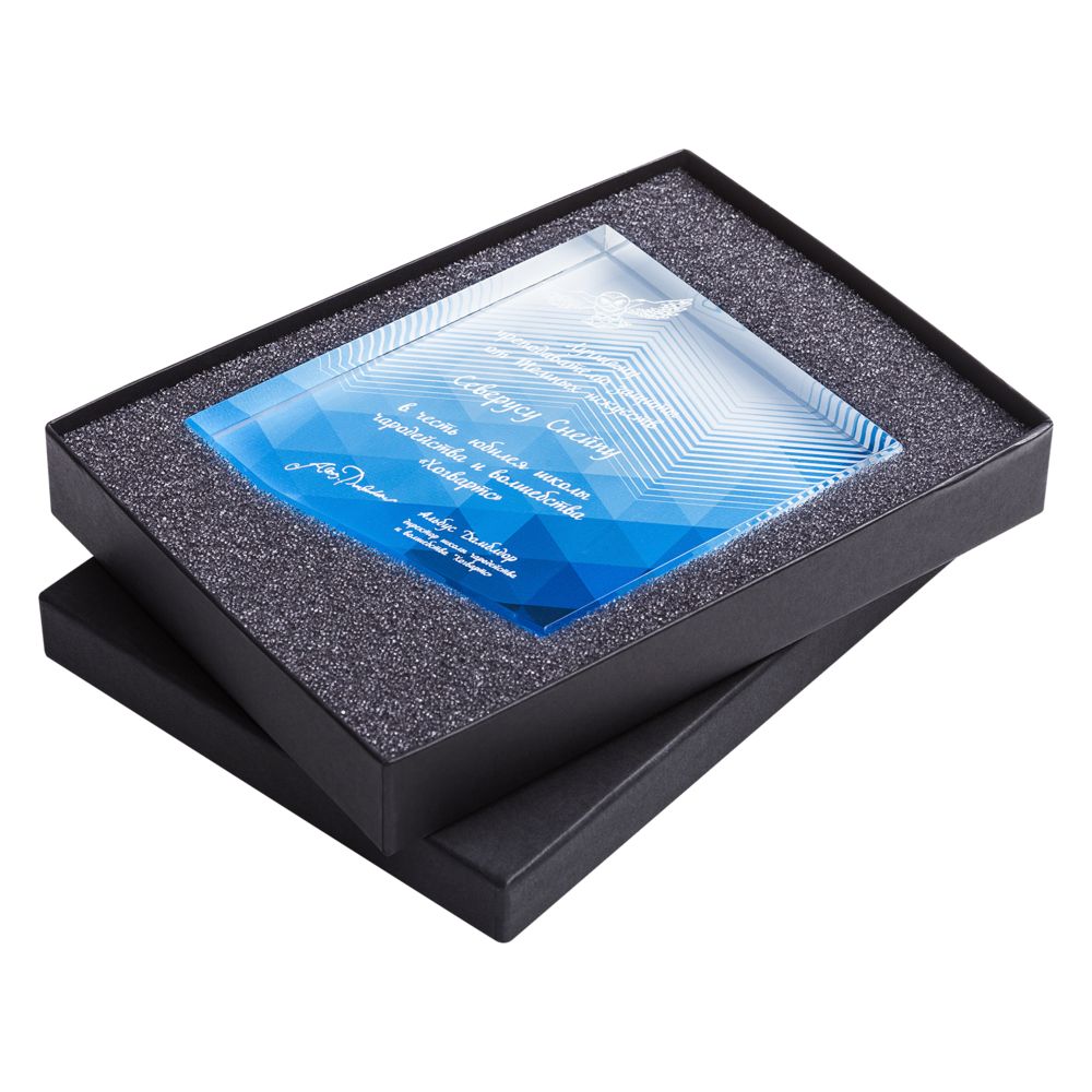 Если нужно что-то особенное, можно докупить коробки из ассортимента самостоятельно. Некоторые премиальные стелы из цветного стекла представлены в изысканных подарочных коробках с шелковым ложементом и специальными перчатками для вручения: высший уровень исполнения.