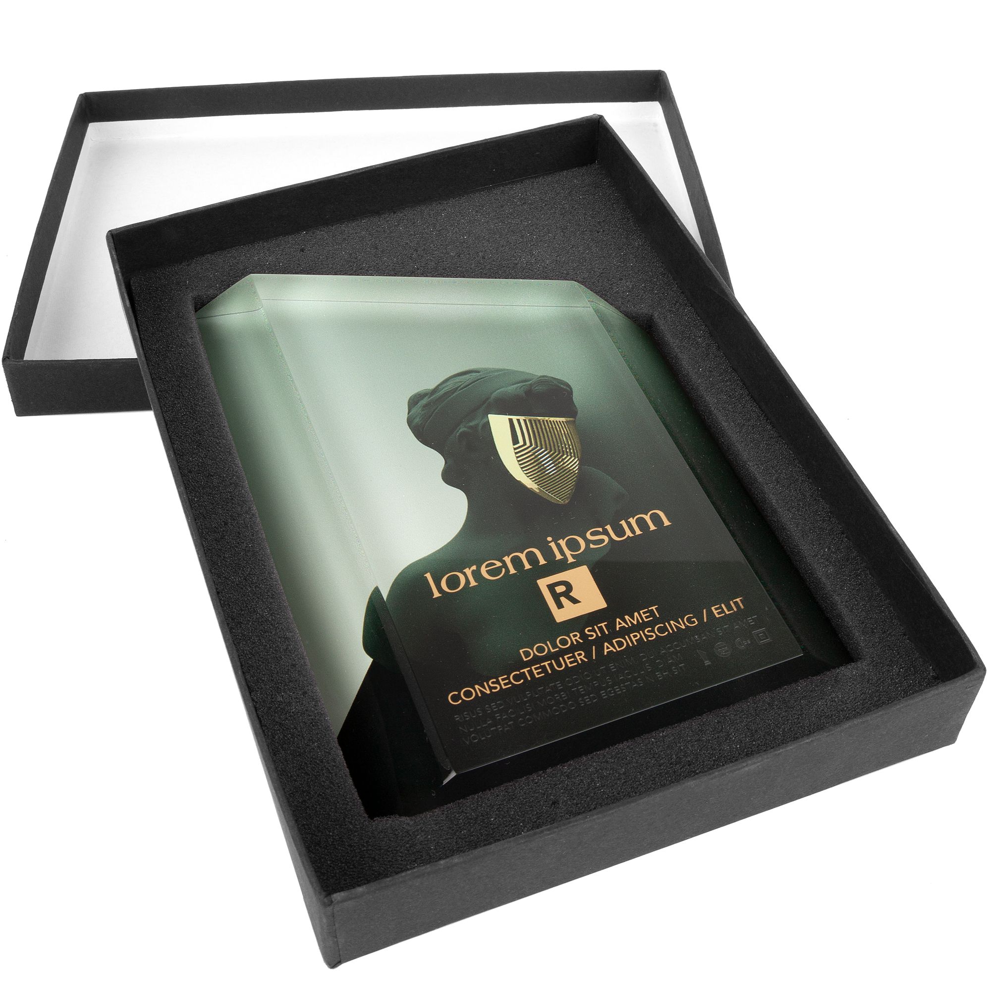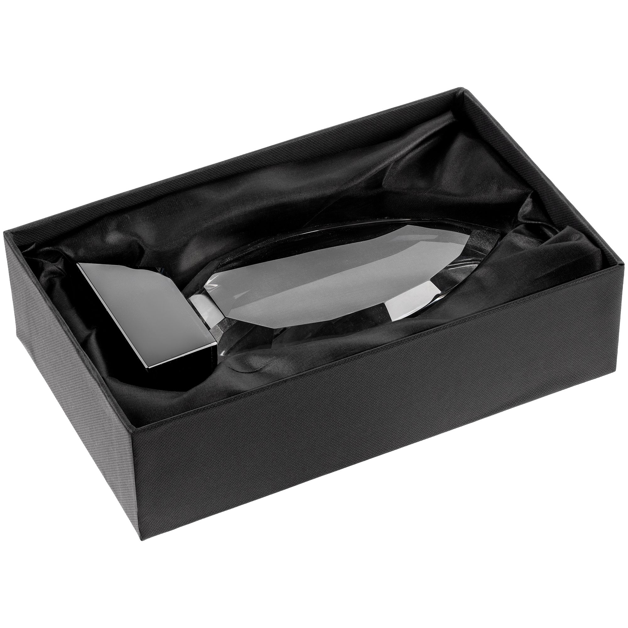 Многие наградные изделия из нашего каталога уже дополнены подарочными коробками с ложементом. В основном это лаконичный черный вариант из переплетного картона (на магнитном клапане или без) с большим полем нанесения. С помощью декорирования упаковки можно создать единый гармоничный комплект, дополнив награду по смыслу и стилю.