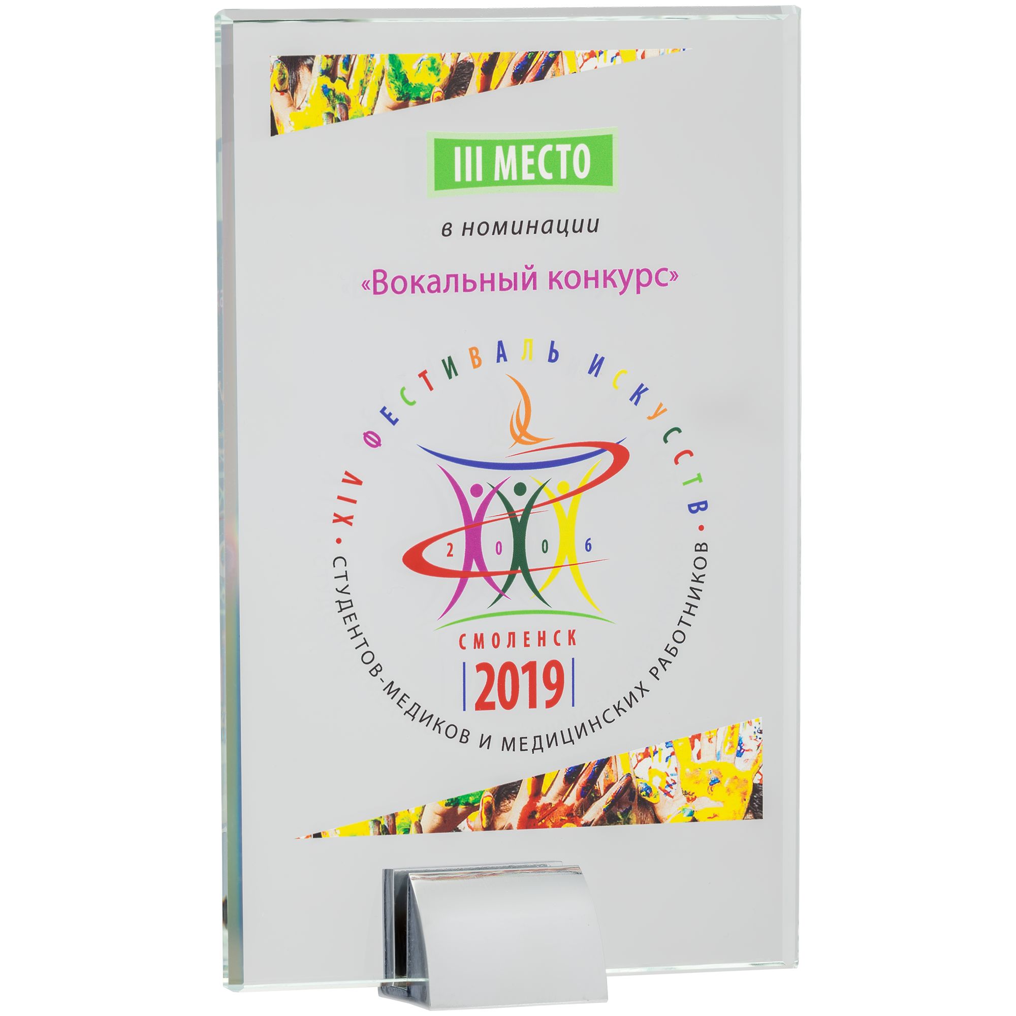 - Нередко при заказе наградной продукции встречаются переменные данные: например, может понадобиться напечатать разные фамилии участников или названия компаний, сохранив при этом основной дизайн нанесения. Один из оптимальных вариантов — нанести полноцветную УФ-печать на тираж акриловых стел и добавить к ним именные шильдики с лазерной гравировкой.