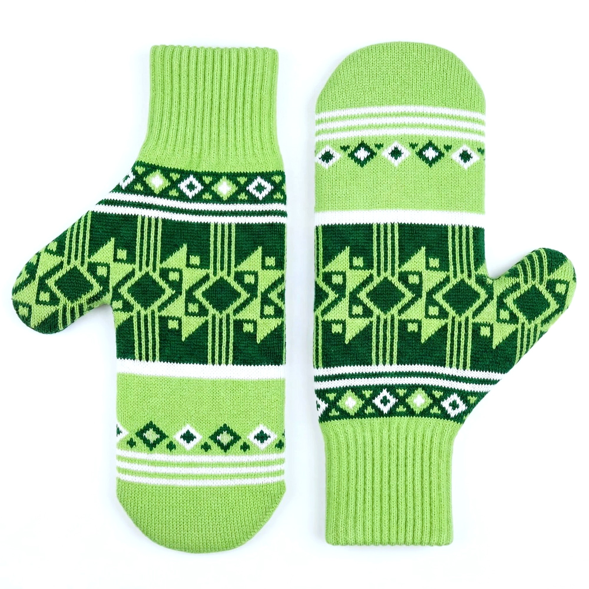 - И, наконец, цельнокроеные варежки Mani из акрила в зеленых тонах с таким же узором. Они легкие и мягкие, с удобной манжетой.