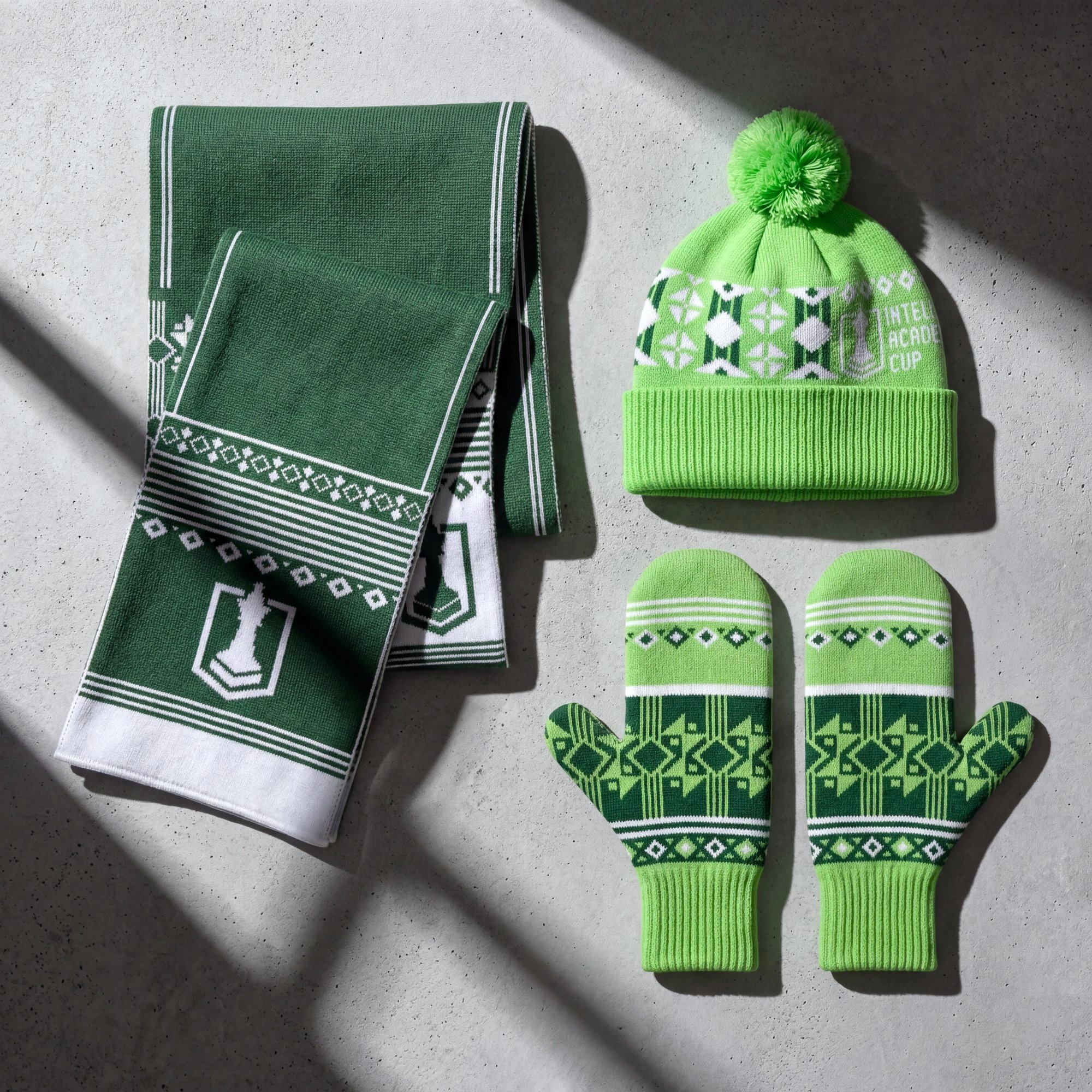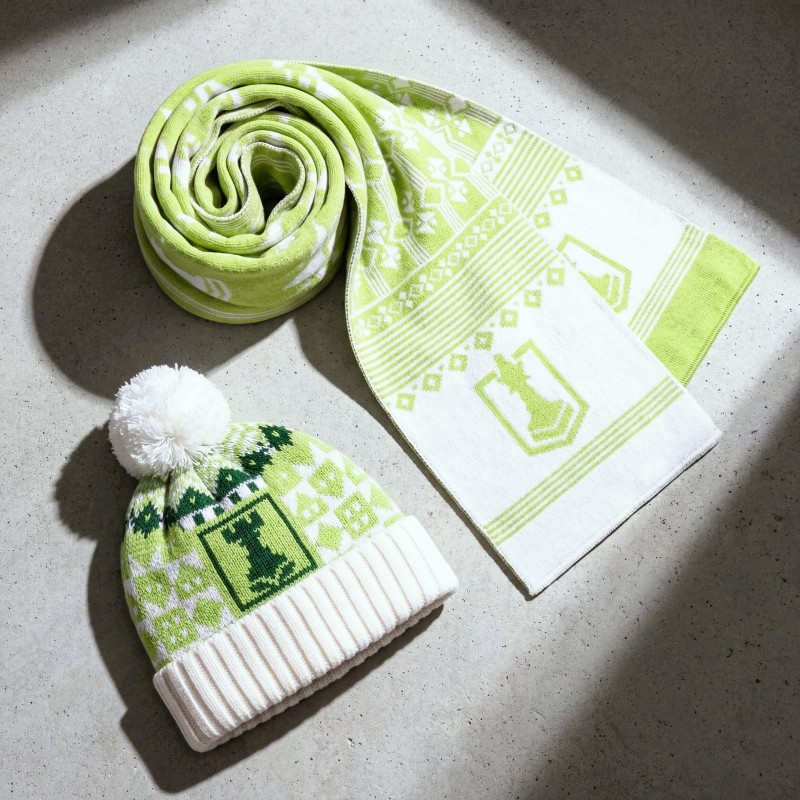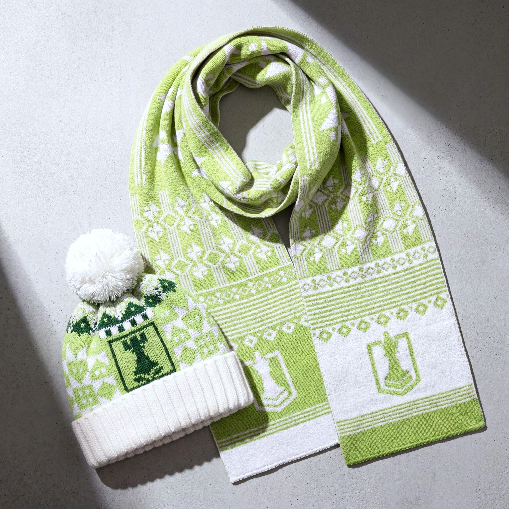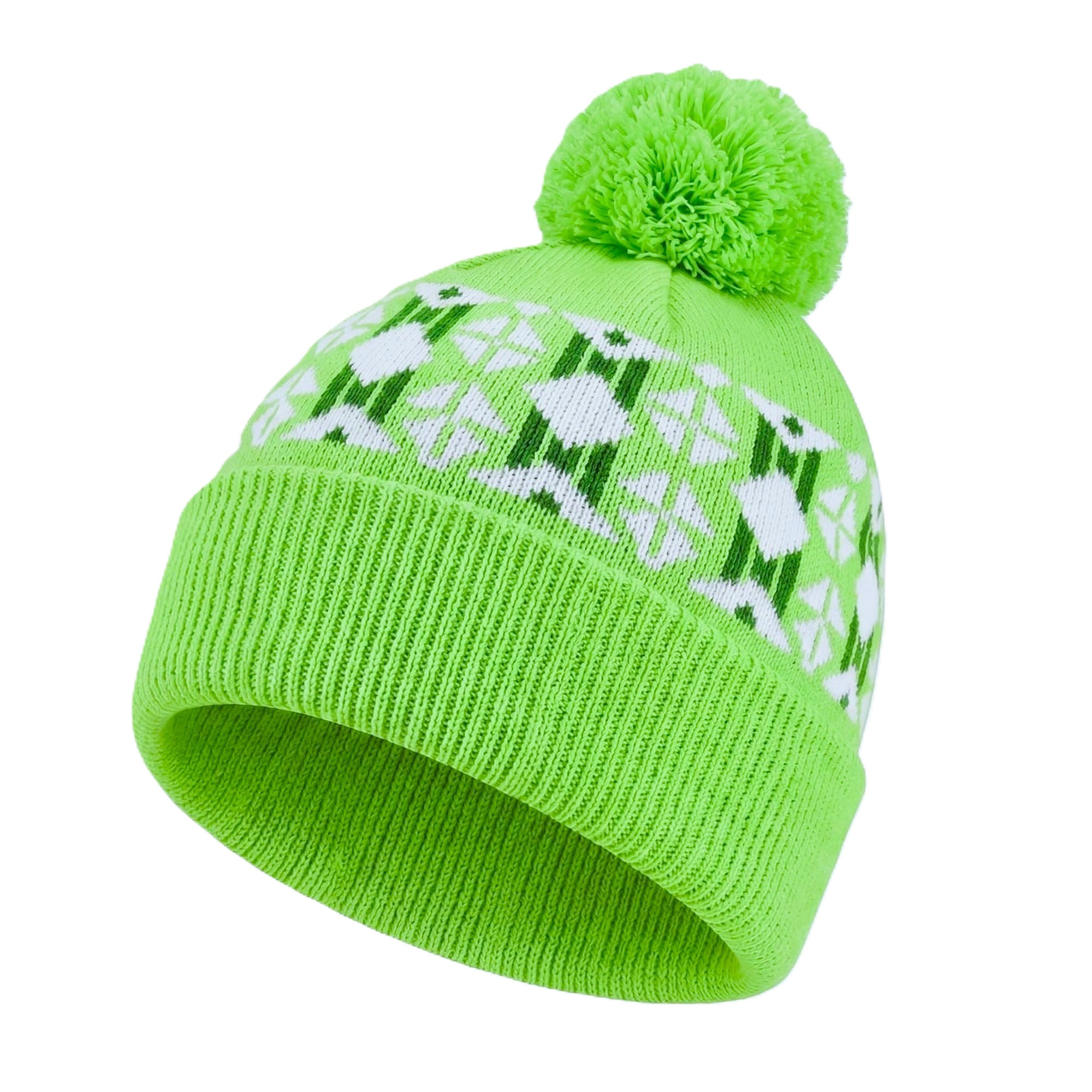- Салатовые акриловые шапки Tricksy Fullur с отворотом и помпоном. Логотип мероприятия и паттерн выполнены нитками контрастных цветов.