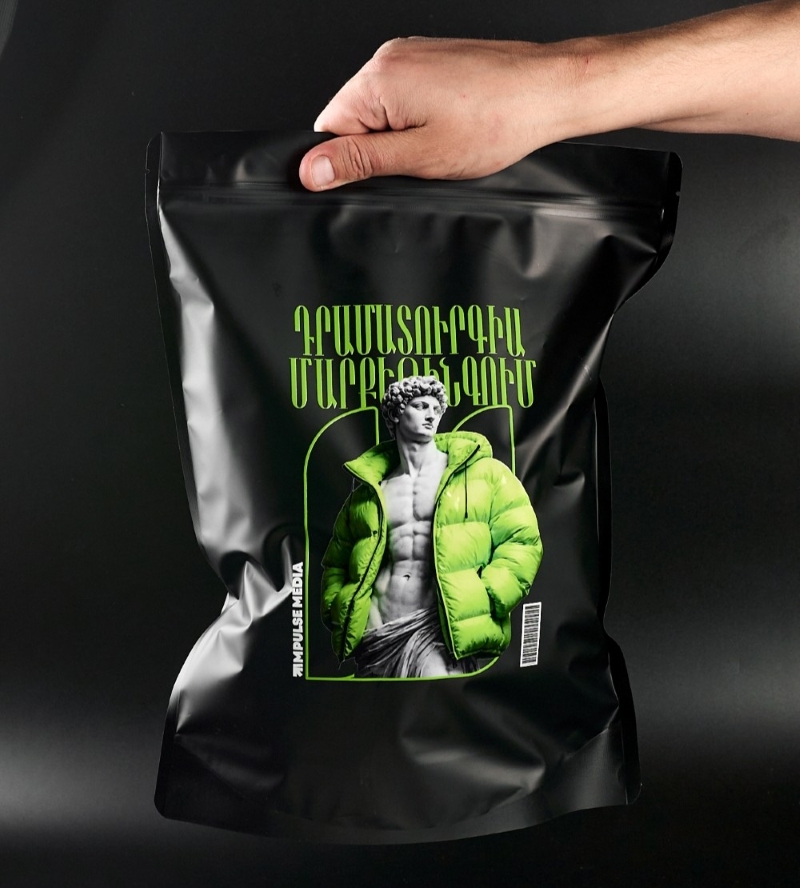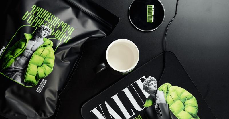 Своеобразный заголовок на армянском языке можно перевести как «Драматургия в маркетинге» — вполне актуальная бренд-стратегия. Логотип агентства на каждом изделии дополнен символичным штрихкодом как особым знаком качества.