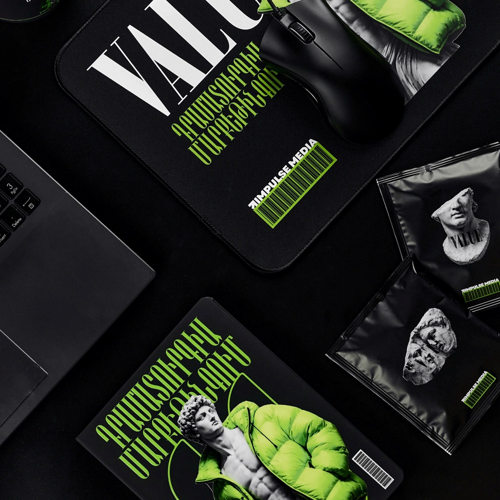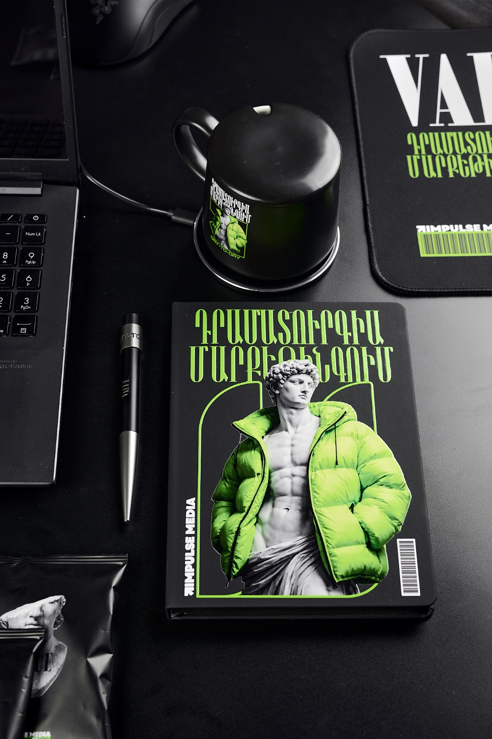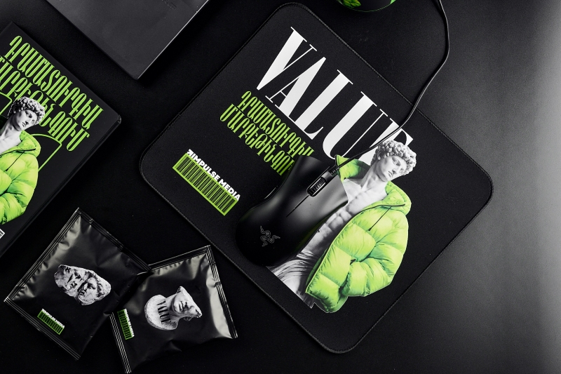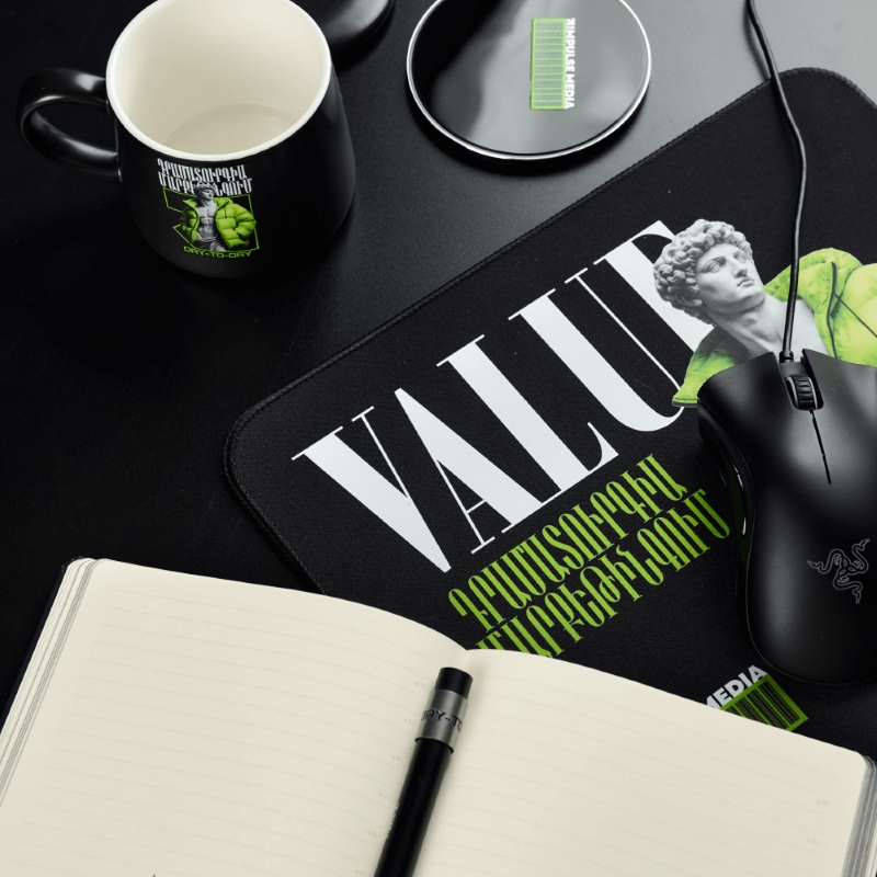 В графической части концепции Impulse Media гармонично совместили традиции и инновации, опору на базовые основы и смелую креативность — одни из главных ценностей компании и ключевых идей самого сета. Набор выглядит современно и премиально: все изделия выполнены в минималистичном стиле, а черный цвет идеально оттеняет контрастное нанесение. Лаконичные и понятные надписи на разных языках, в том числе и армянском, усиливают воздействие, помогая подчеркнуть неразрывную связь единой команды.